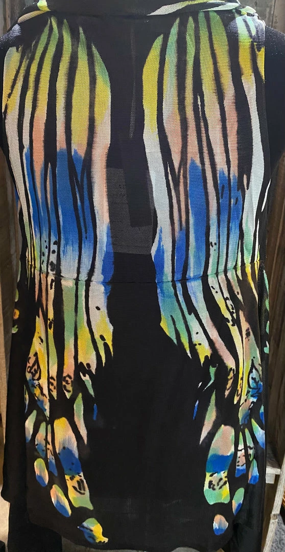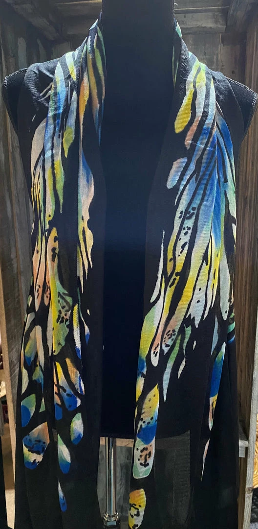 Very beautiful multi color hand painted silk. Each vest is one of a kind in print it can be worn 3 different ways.