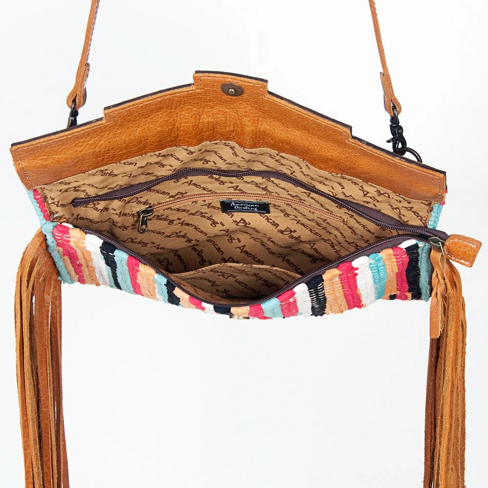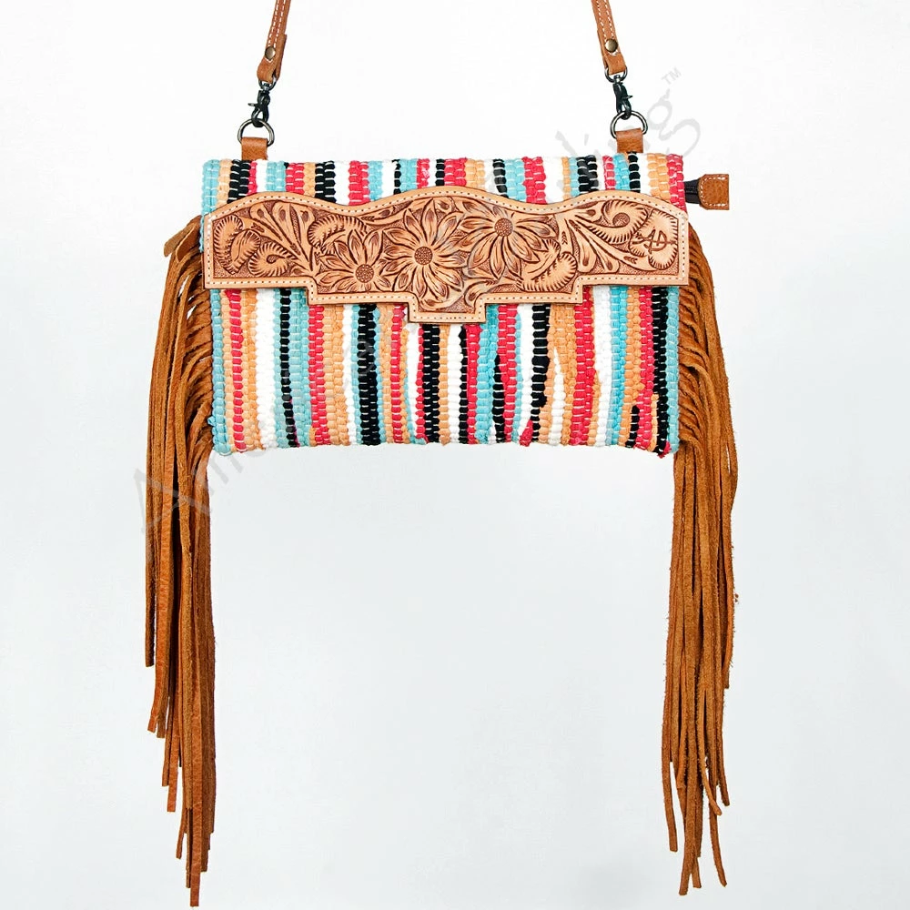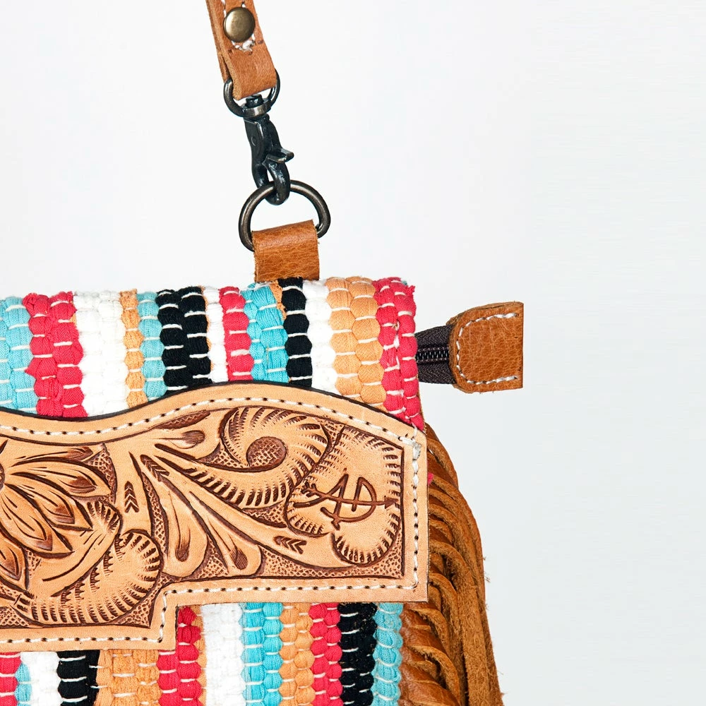 Woven body with tooled front and leather fringe sides, zip and mag snap closure. Interior zipper pocket and open pocket. Crossbody strap included.