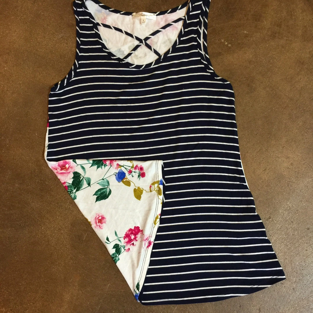 Striped Andree tank blue and white with Floral back and cris cross neck.