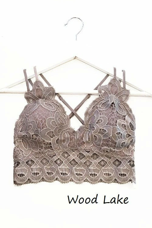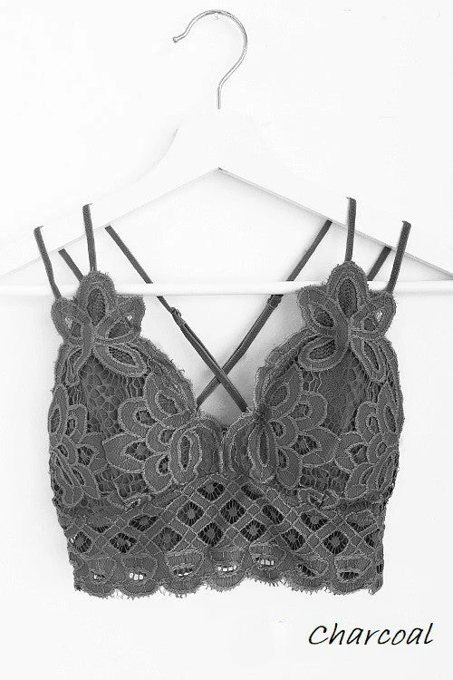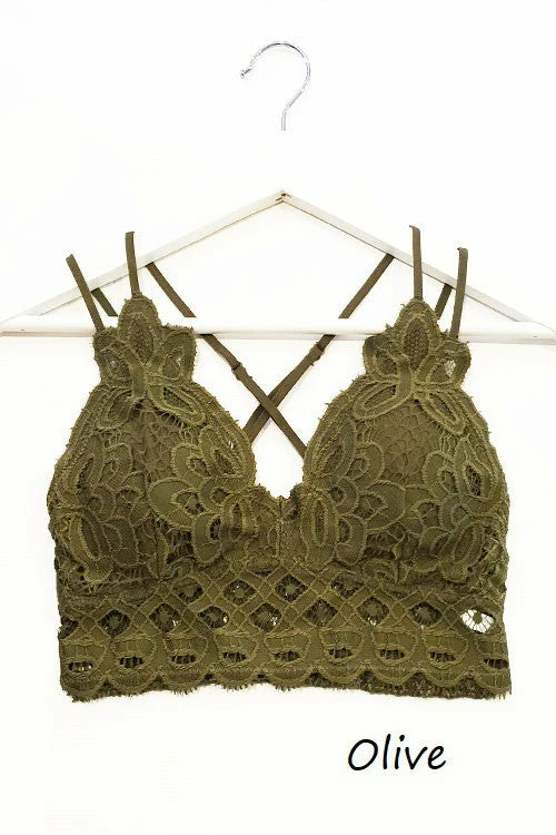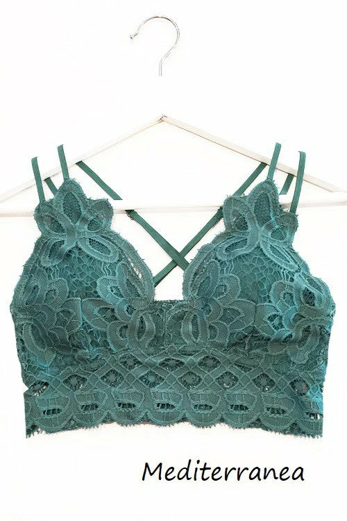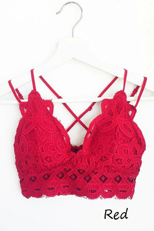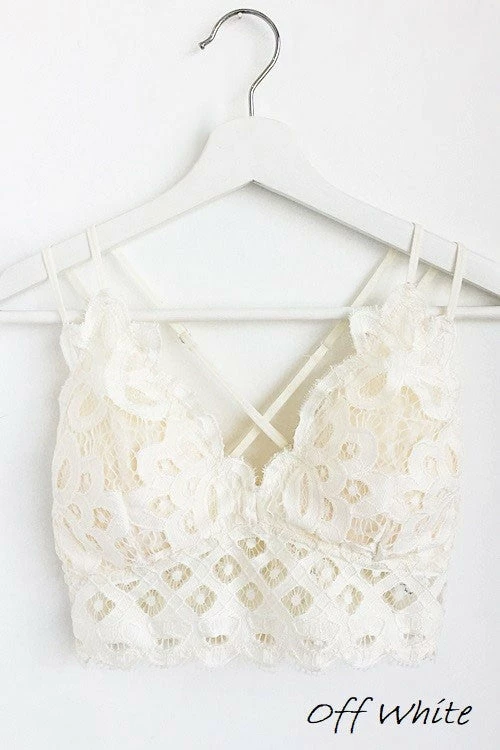 Beautiful crochet lace bralette, pull-over style, long line, all-day comfort, v neckline, removable bra pads, criss-cross straps at back, adjustable bra straps, and the perfect amount of stretch. 60% Nylon, 40% Cotton S: 32B, 34A, 34B M: 34B, 34C, 36B L: 36B, 36C, 38B,38C