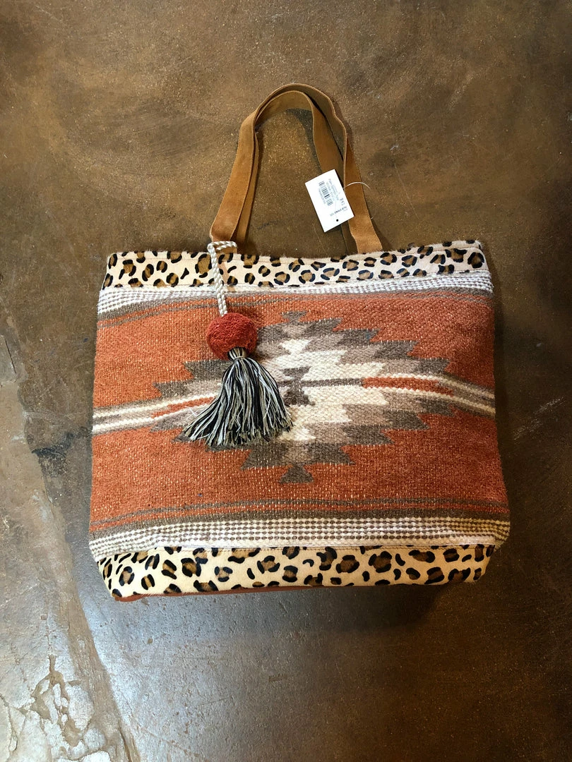 Tapestry tote with leather straps and cheetah hair on. Has 2 open pockets and 1 zip pocket on the inside. Earth tones with Rust Denim back: 19 X 14 1/2