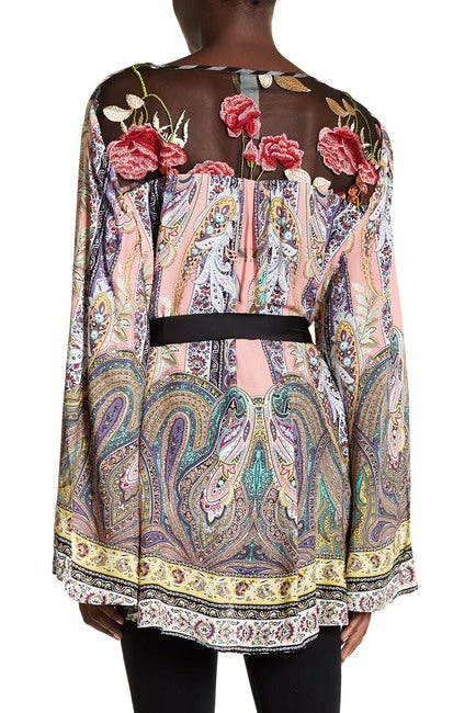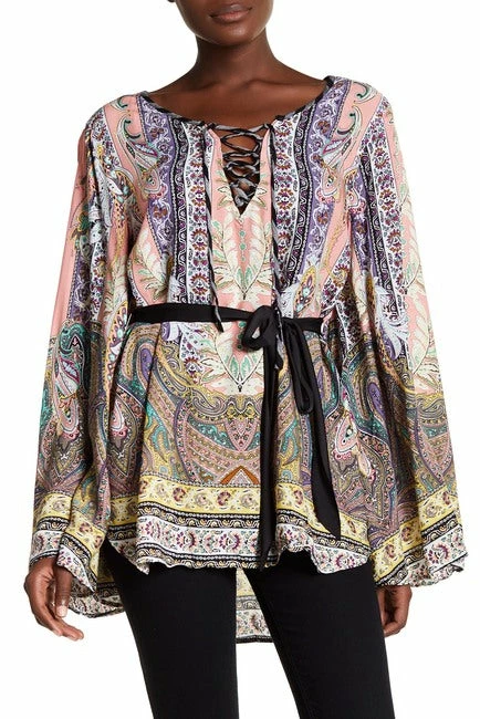 Crew neck with front lace up – Long bell sleeves – Slips on over head – Allover pattern – Removable self-tie at waist – Hi-lo hem – Approx. 24″ shortest length, 29″ longest length (size S) –