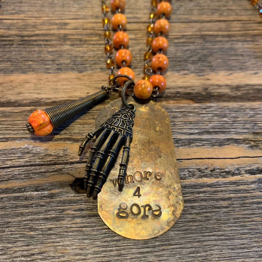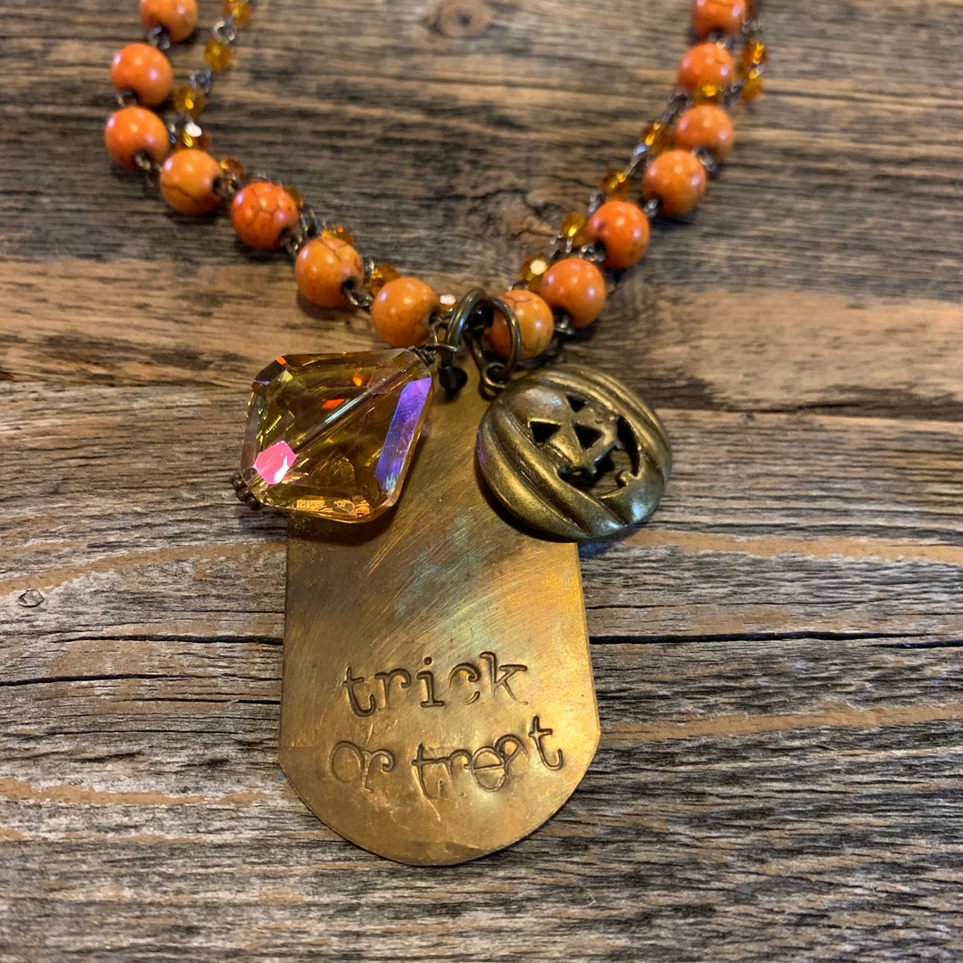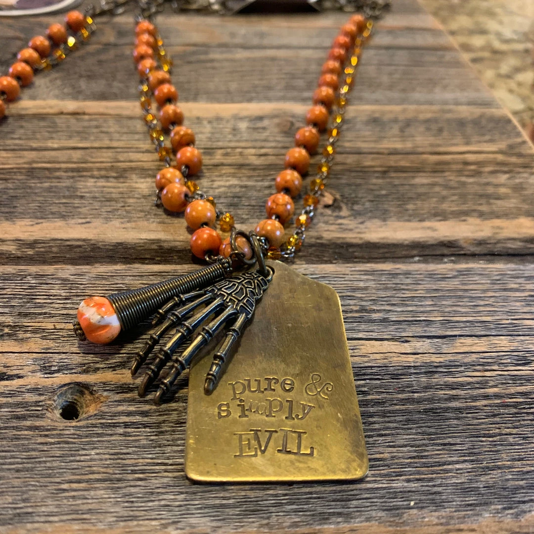 Art by Amy Spooky Halloween Necklace made of beads and chains 2with dog tag sayings and dangle charms . Β