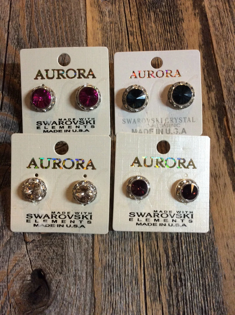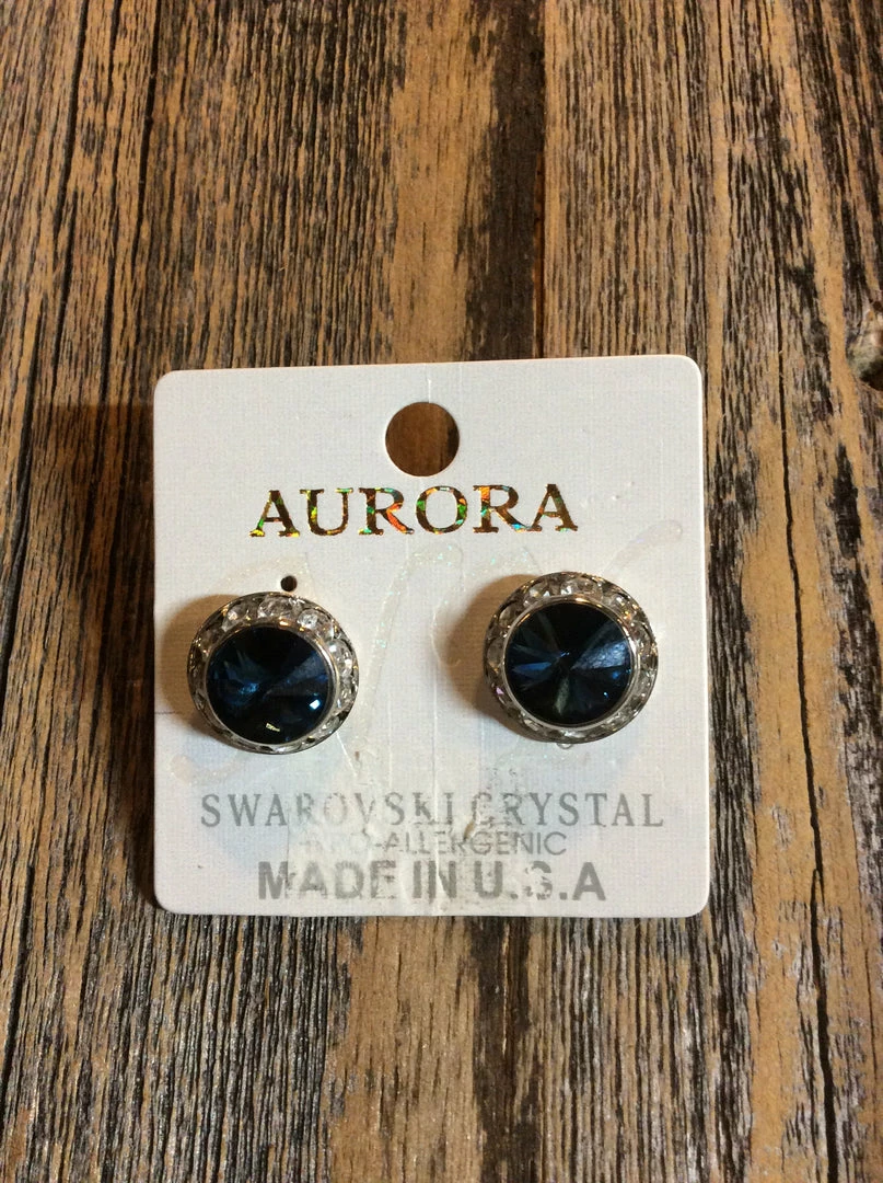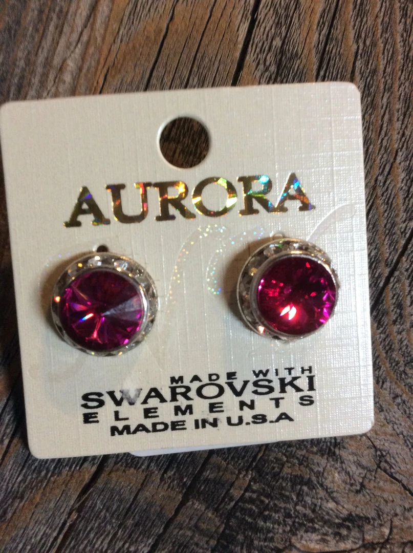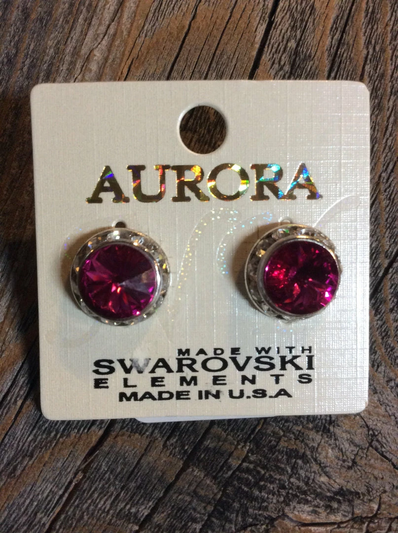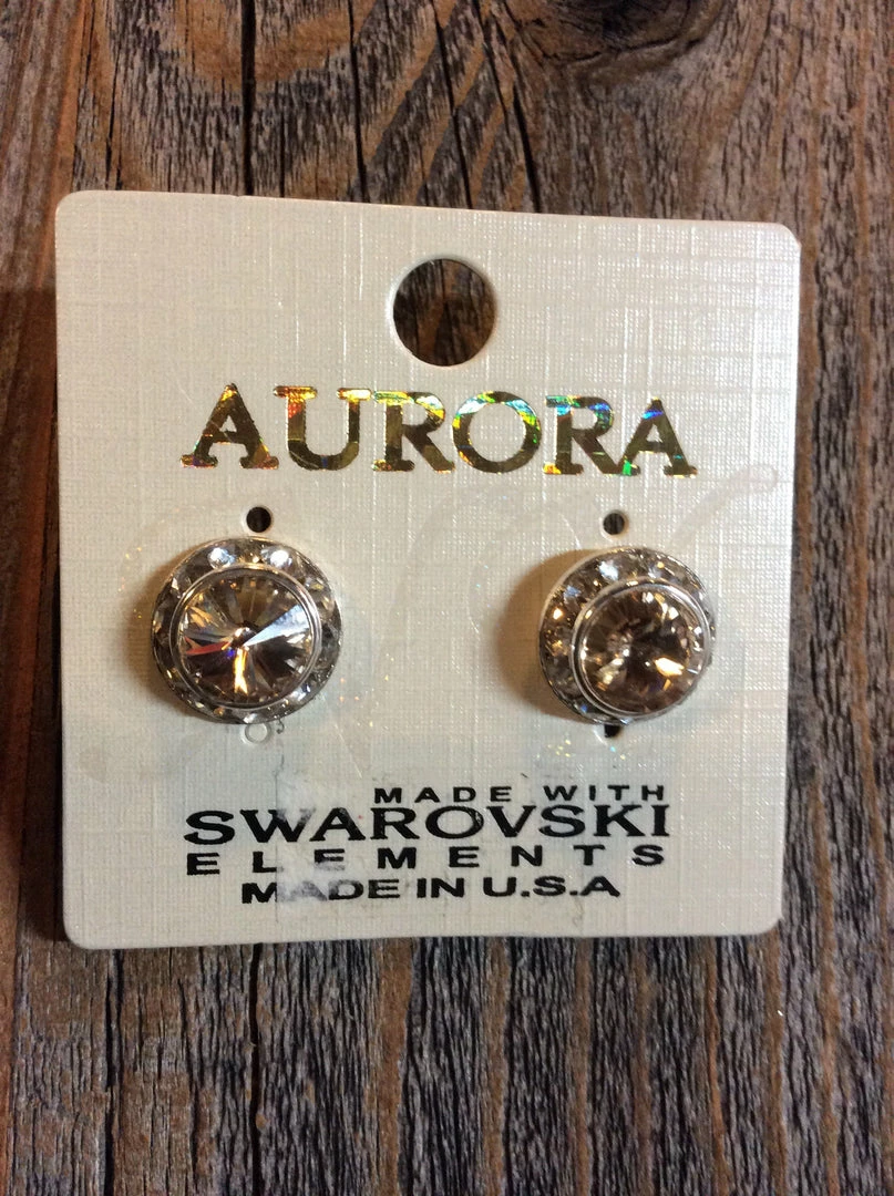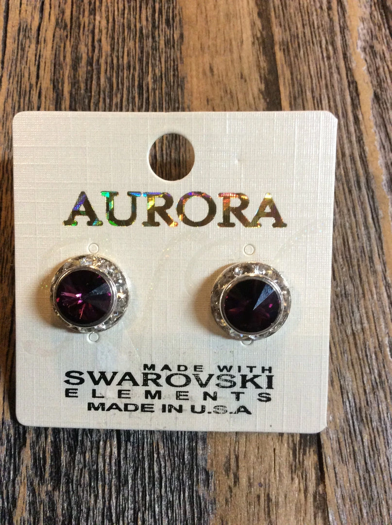 Swarovski crystal elements stud earrings with a center colored crystal and a halo of clear crystals. Lead compliant, 9/16-10/16″ Round (approx)