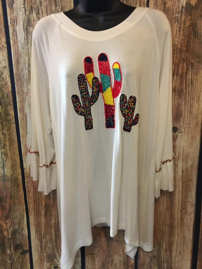 Avani Cactus Needlepoint Tunic in off white with colorful cactus and ruffle sleeves. Hemline has angled hem.