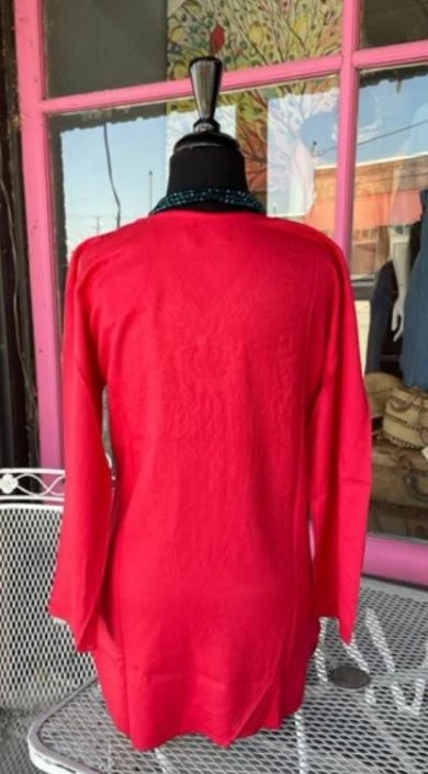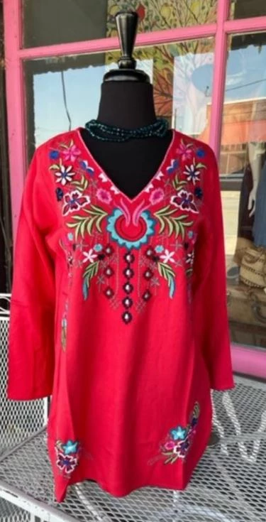 Gorgeous piece with embroidered detailΒ V-neck tunic top w/ a slight bell sleeve.