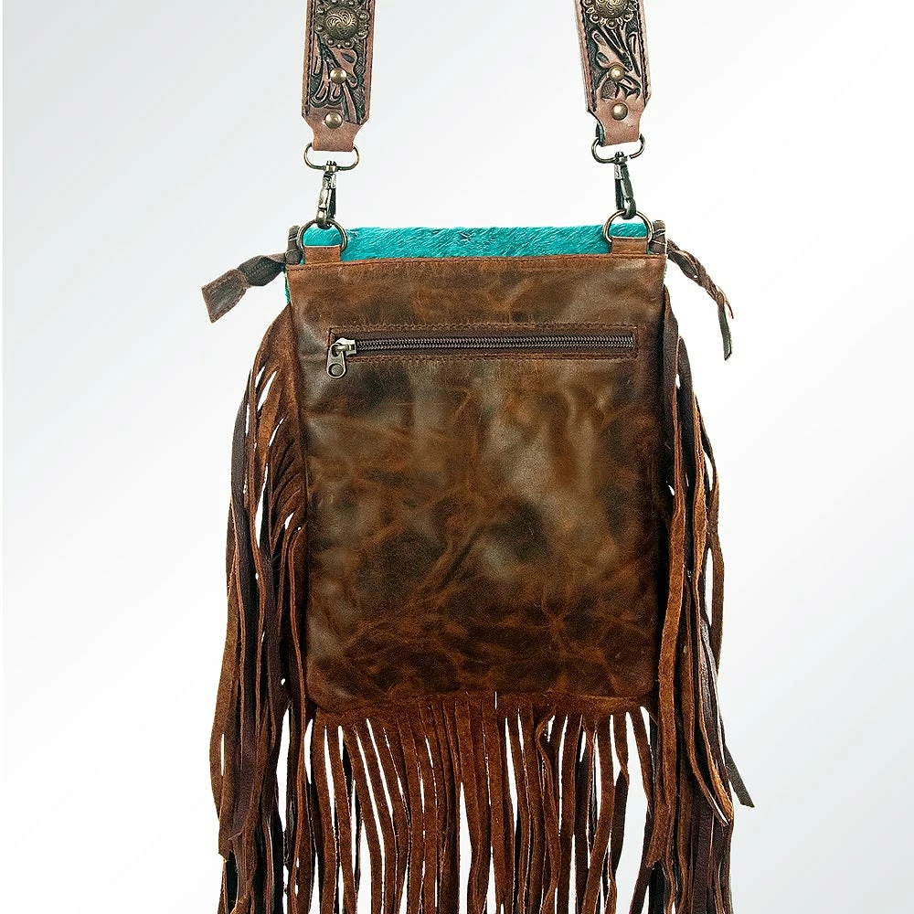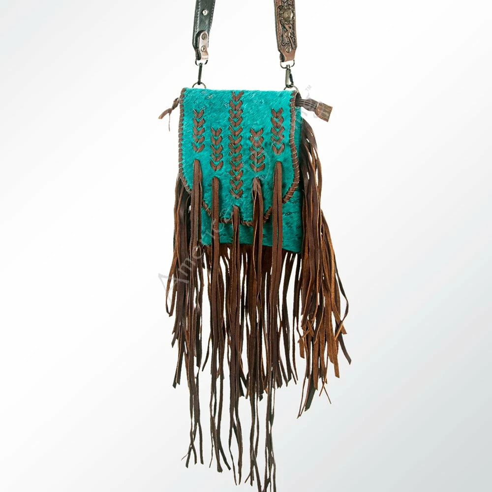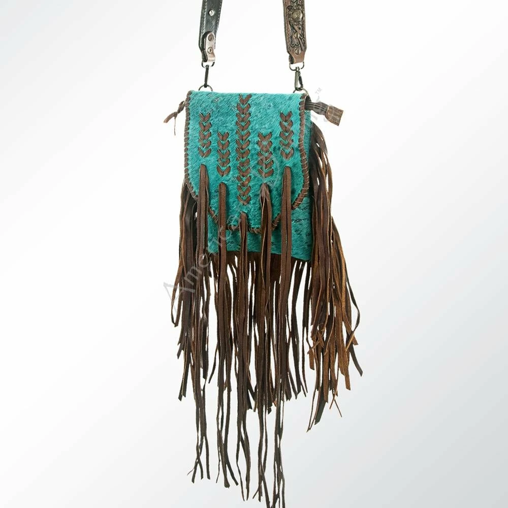 American Darling Turquoise Acid Wash CowhideΒ Pursw with leather design on font flap accented with fringe.