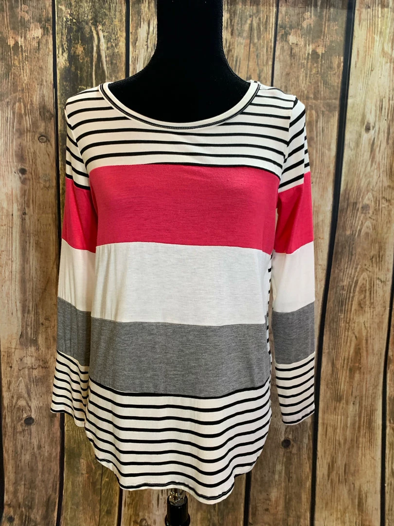 Black, pink ,white, gray Β stripe top like a t shirt fabric.Β Super soft and vibrant colors.