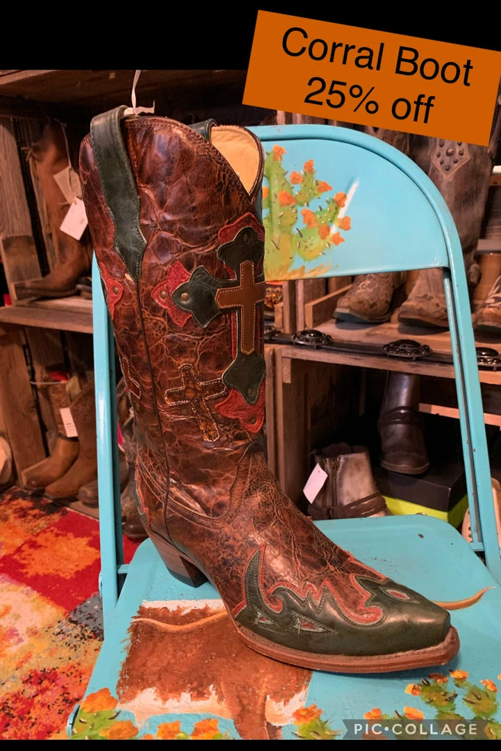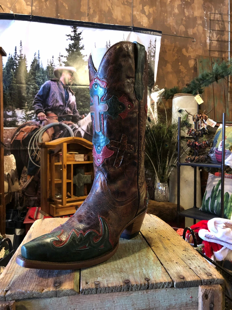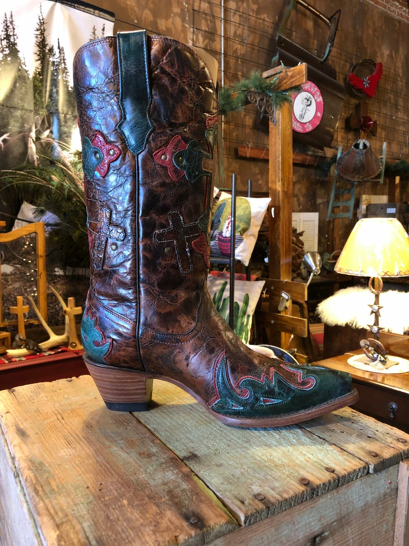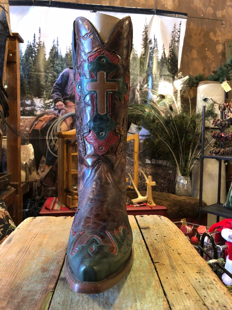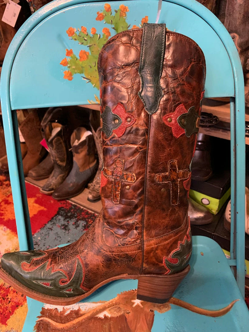 Chestnut marbled brown leather with overlay crosses in red, green and brown leather.Β