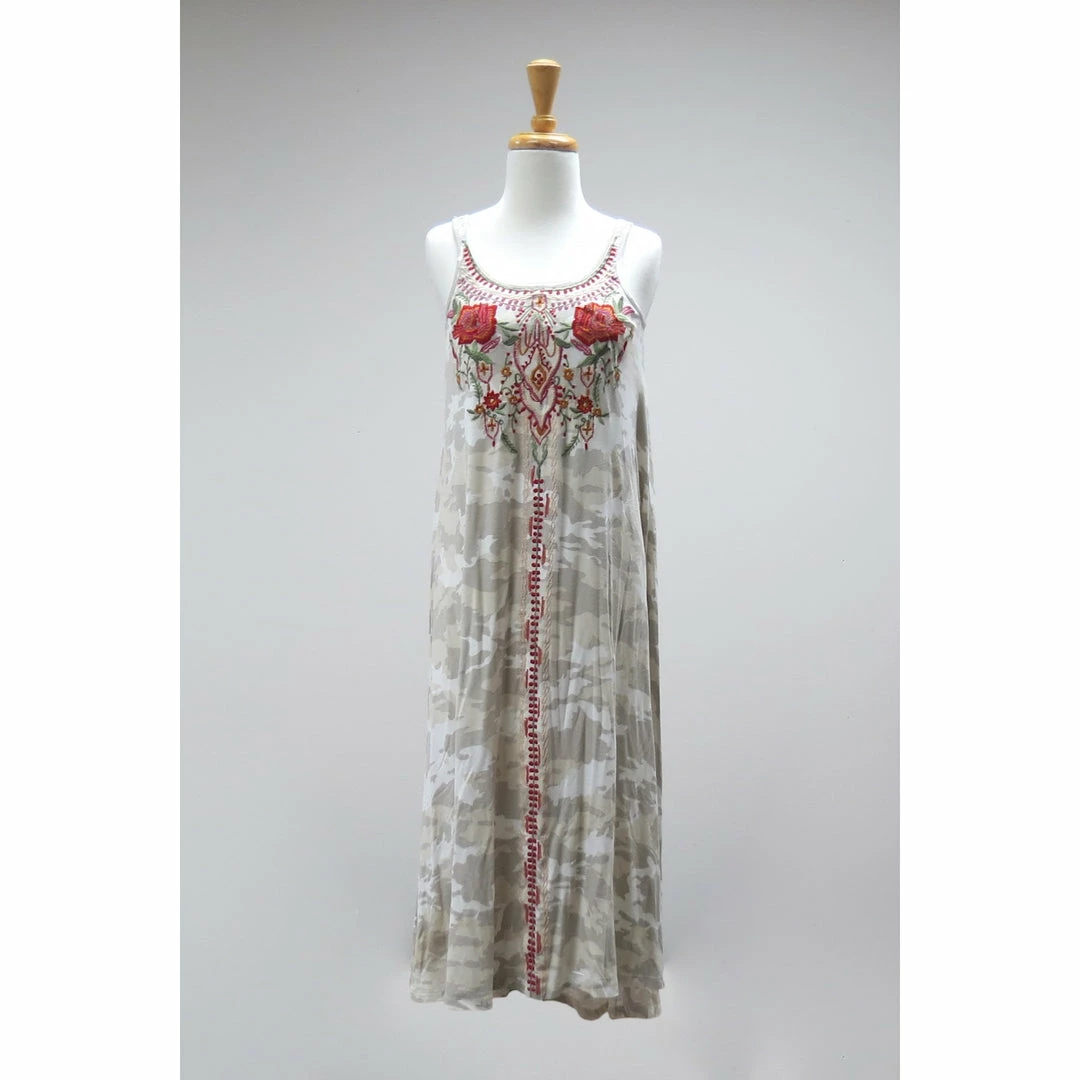 This bohemian-chic dress features a washed look, multicolor vintage-inspired embroidery and camouflage print.