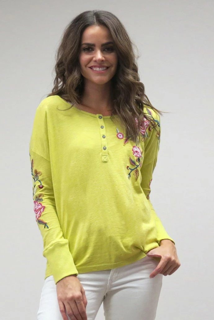 This bohemian-chic top features henley-style buttons and multicolor vintage-inspired embroidery.Β