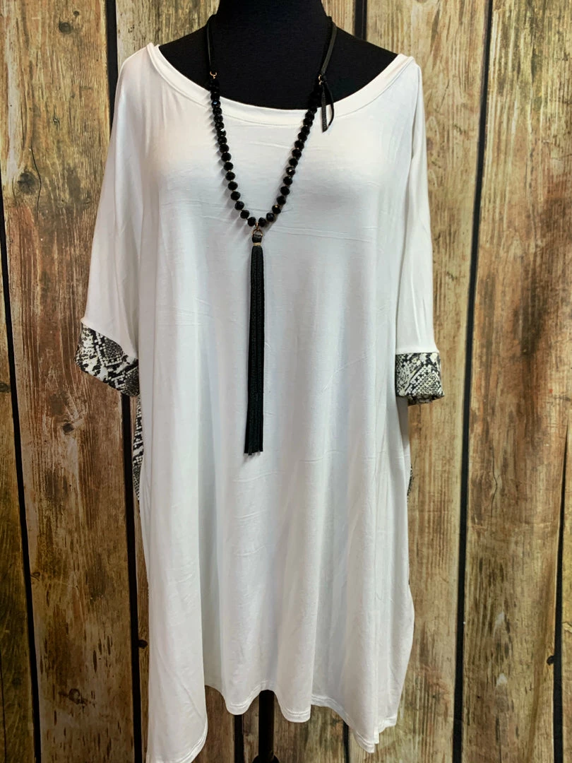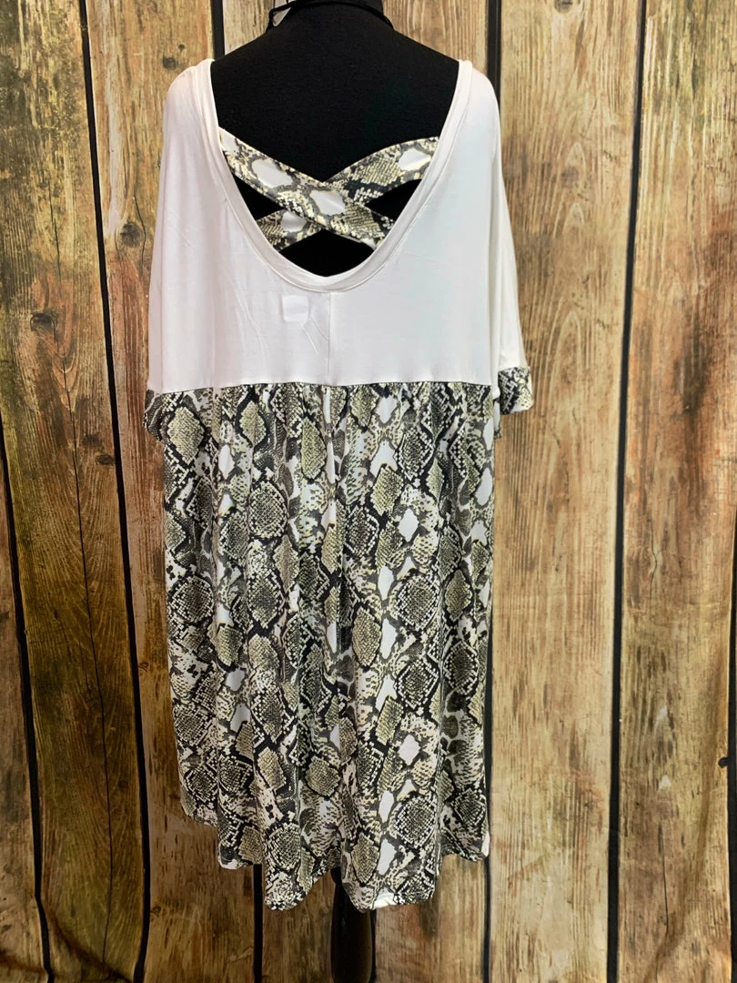 Ladies Plus Size Snakeskin Tunic with Criss cross straps in back . Β Cream front and sold snake on back . Β Super soft Made in USA.Β