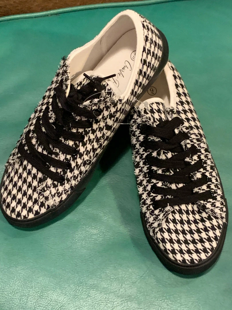 Charlie Paige Black/White Houndstooth Tennis Shoe with. Lack laces and black soles. Β Sizes run big so go down a size .Β