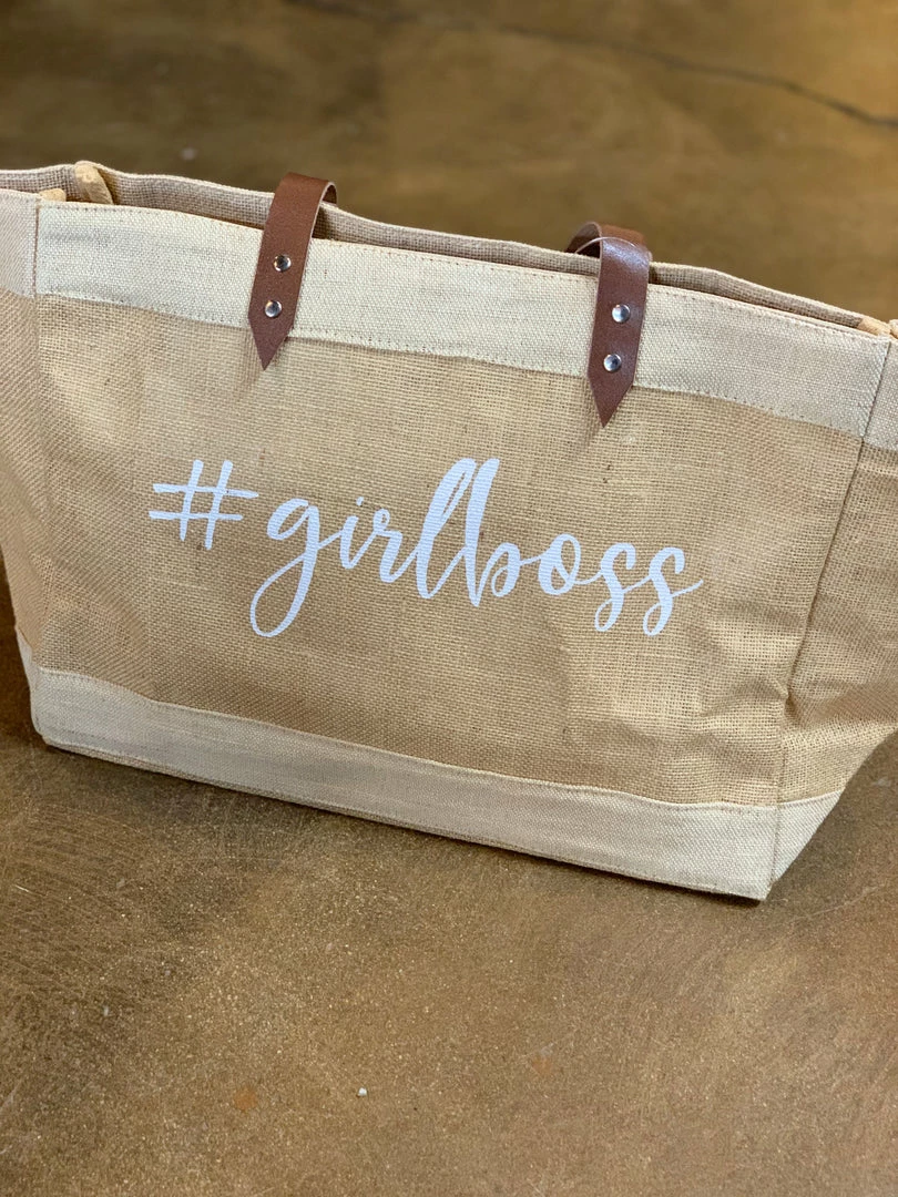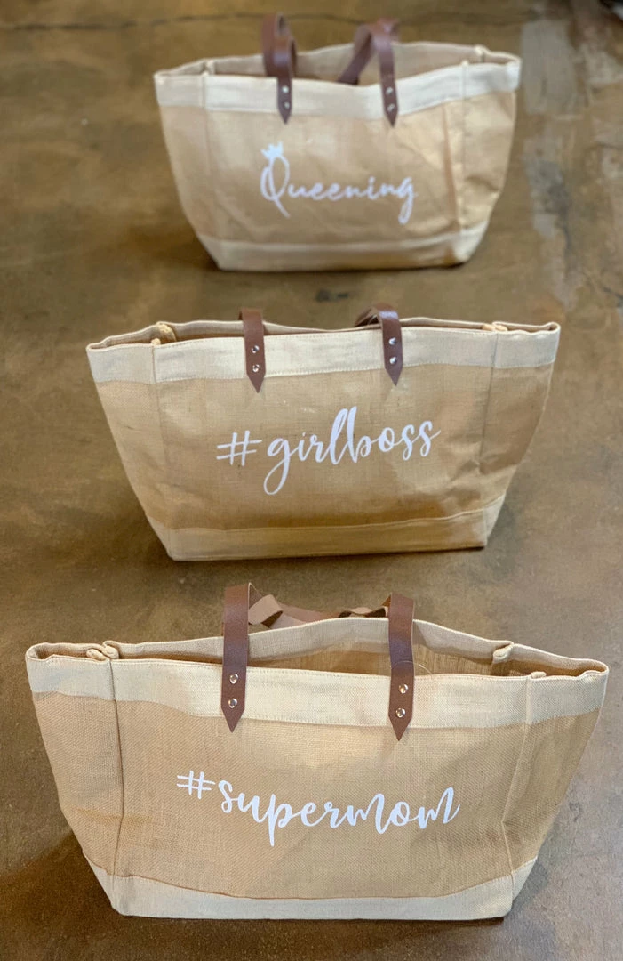 Wide jute market tote with a sentiment in white typography and brown leather handles. 3 Assorted Designs: #SUPERMOM, QUEENING, #GIRLBOSS. 2 of each design. Jute, Juco, Leather.