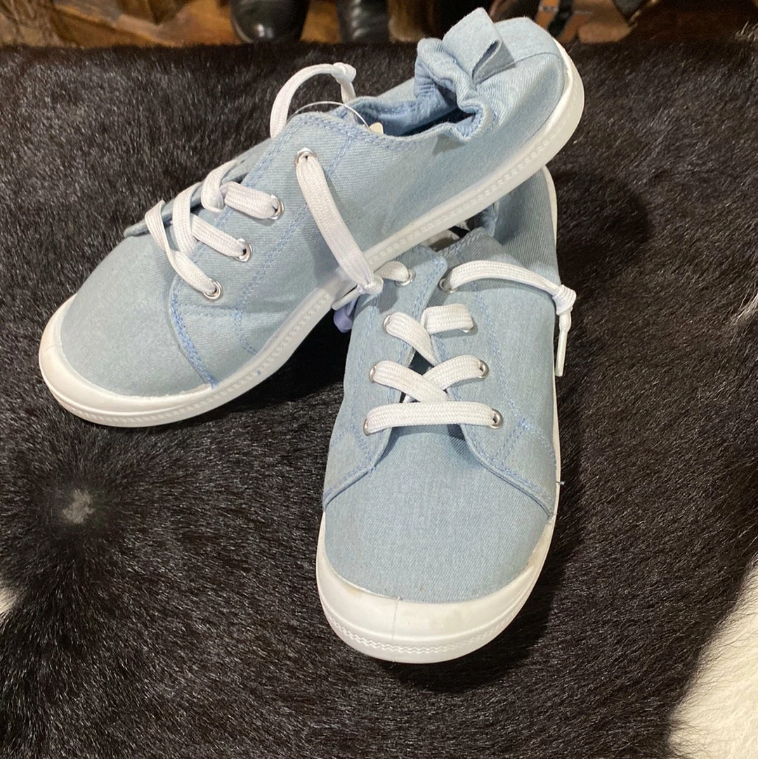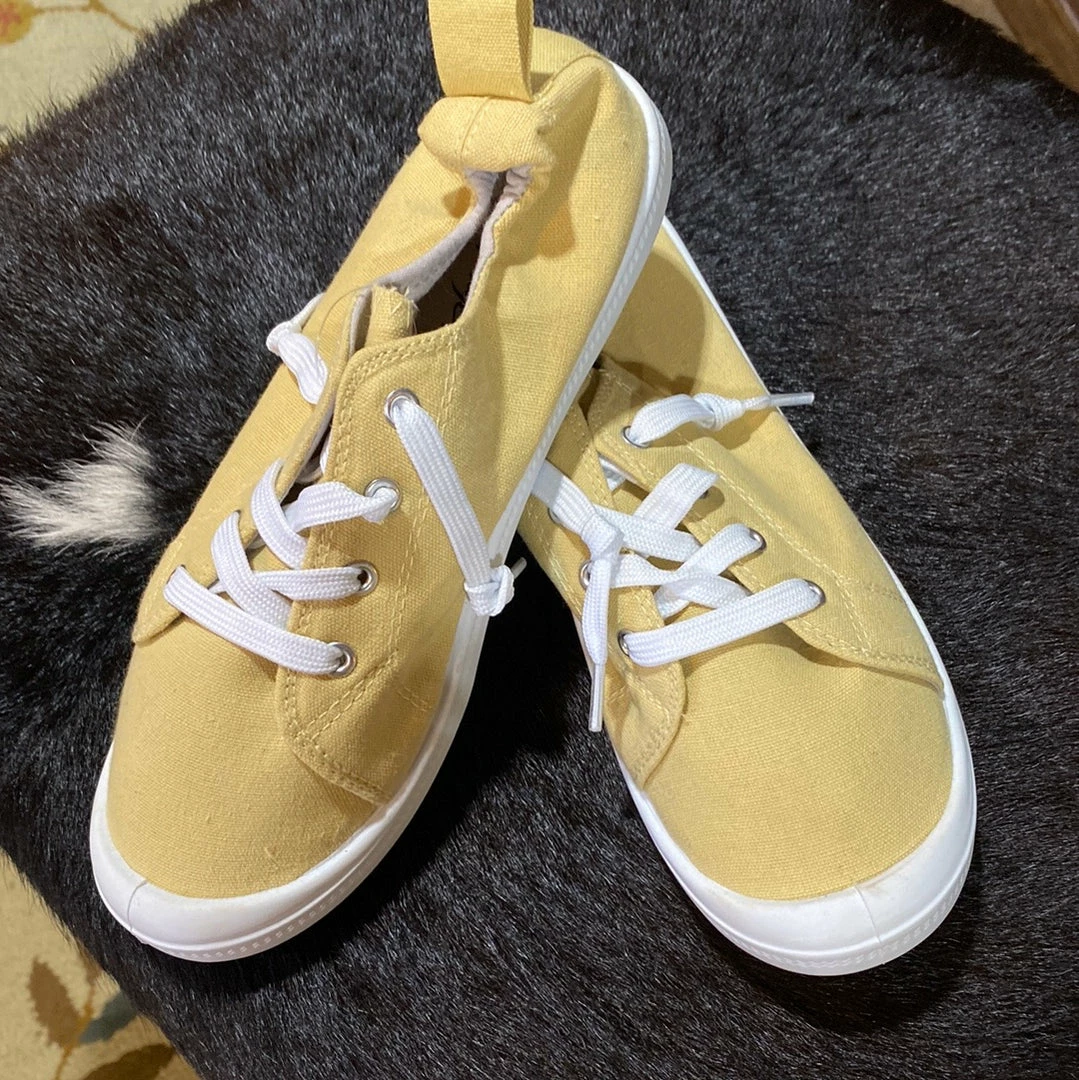 Charlie Paige Canvas Sneaker in black, denim, yellow with white laces and white rubber soles.