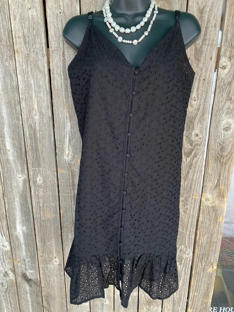 Eyelet Dress with button front and spaghetti straps has lined bodies. 100% Cotton.