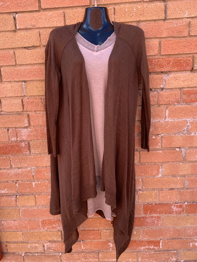 This long cardigan has a multi-level hem that sides just below around thigh length.ย Beautiful brown is perfect for fall.ย Light weight for those fall days and the perfect piece to layer with.ย 100% Acrylic