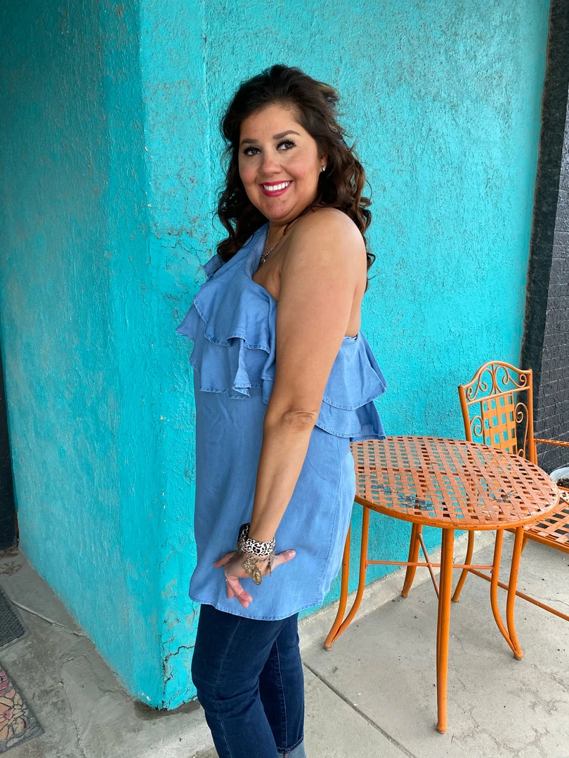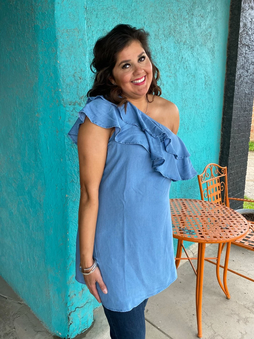 This chambray one shoulder ruffle dress is perfect for those hot summer nights.ย This dress has a side seam zipper for easy on/off.ย