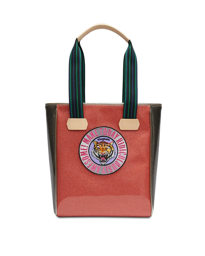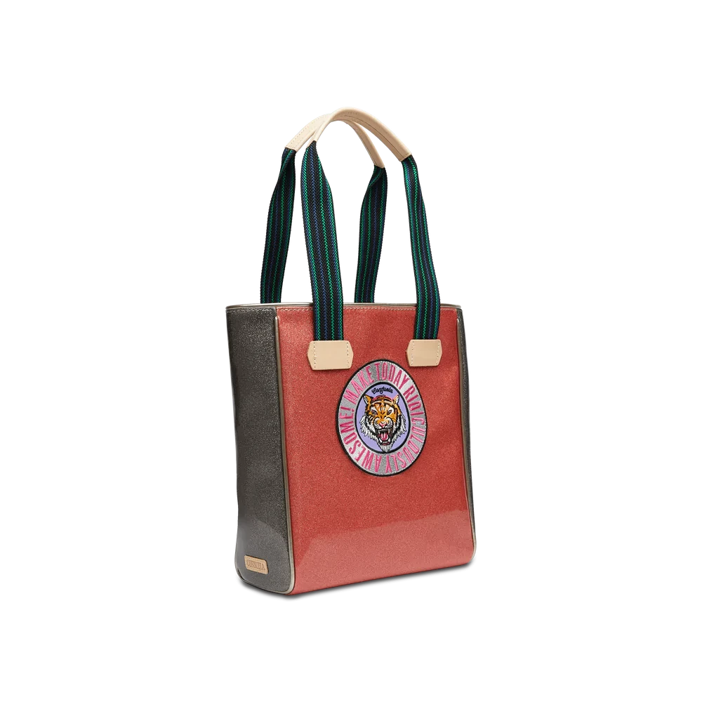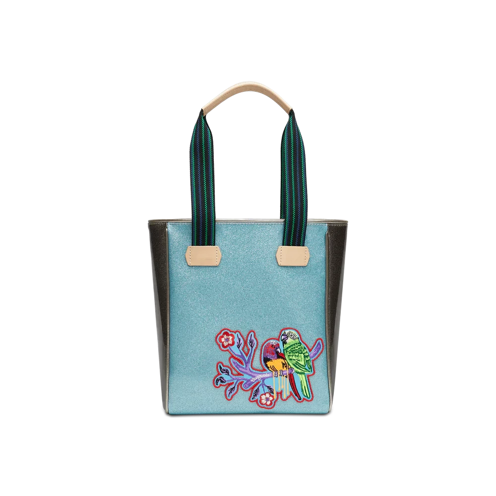 A new member of the Classic Tote family- meet the little sister, Chica! This multi-functional tote is trimmed in natural leather, created to hold its shape, and makes life on-the-go easy with inside pockets- perfect for carrying your essentials.