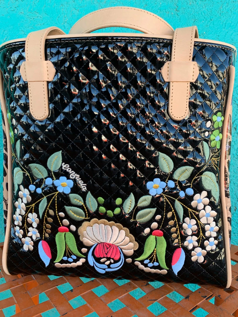 Consuela’s Classic Tote in black quilt meets an explosion of multi-colored flowers embroidered on the front and side panels, with a bold Blue Jag interior. Classic becomes iconic with this natural leather that will soften, darken and mold to your life with everyday use. Their spacious tote offers an easy to load opened mouth design, and comfortably fits your laptop or tablet. Contrasting Laguna interior slide pocket and zipper pocket are great for stashing your keys and cell.