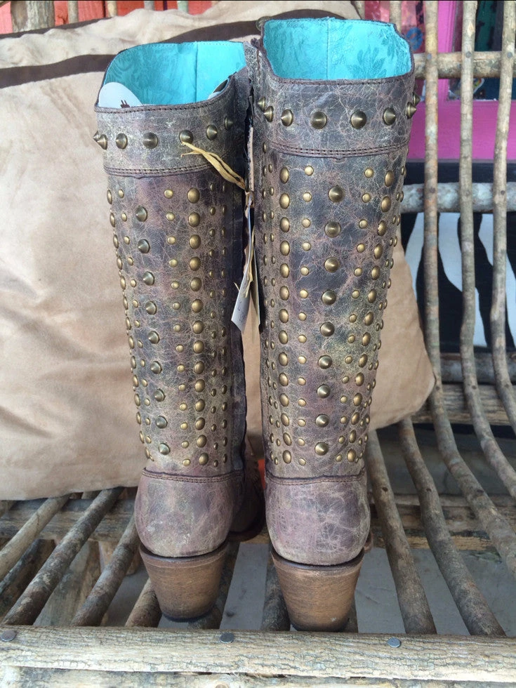 - Distressed Red Foot With Brass-Tone Studs Accent Wingtip Overlay.