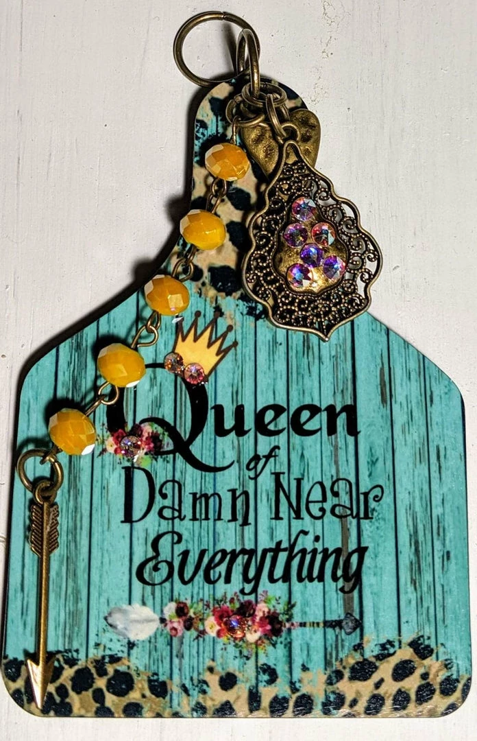 Cow-Tag Queen Dash Dangles Car Charms with leather strands to hang from rear view mirrorΒ Β Same design on both sides.Β Β Accented with various colors of beads and charms.