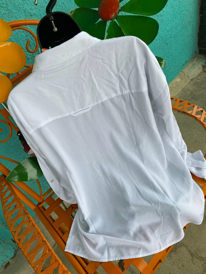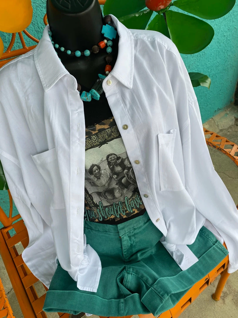 Adrianna White White PrintΒ Blouse- TIED FRONT HEM . BUTTON FRONT . CUFFED SLEEVES . COLLAR