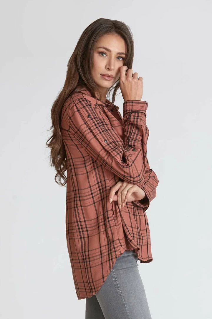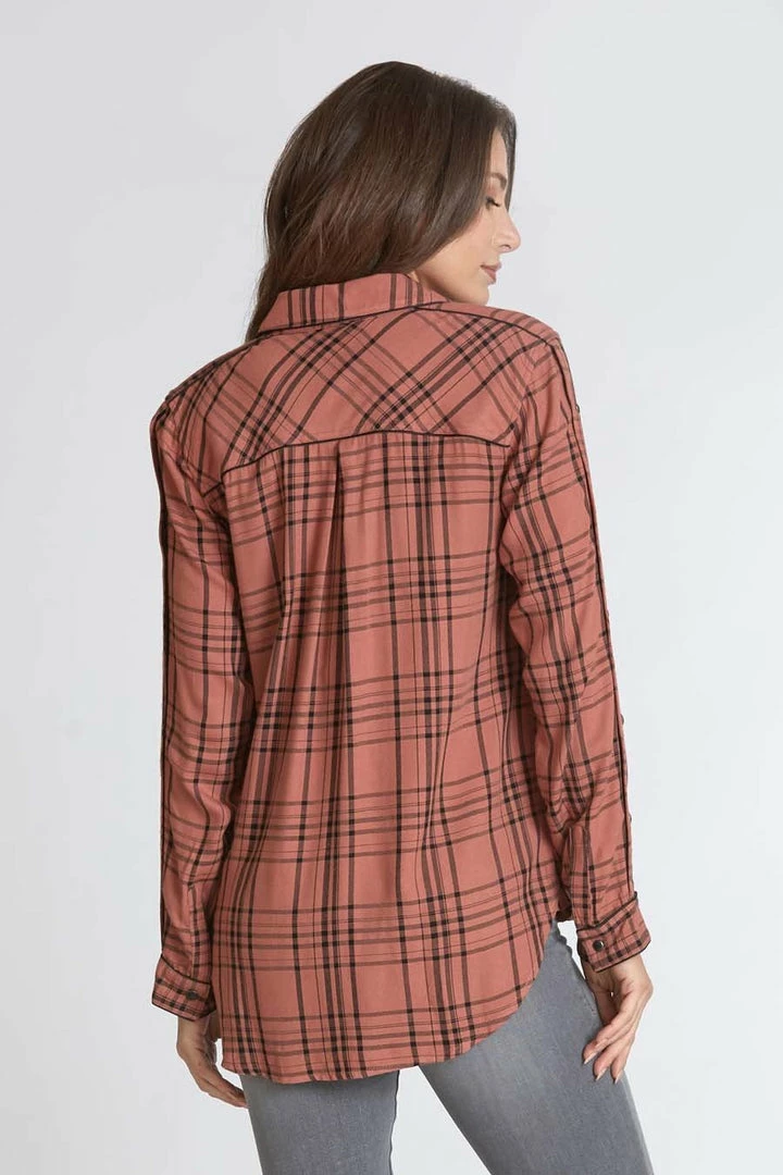 Plaid long sleeves with contrast piping shirt with western style yoke, flap pocket, high low hemline, with snap closure and snaps down the sleeves. 100% rayon