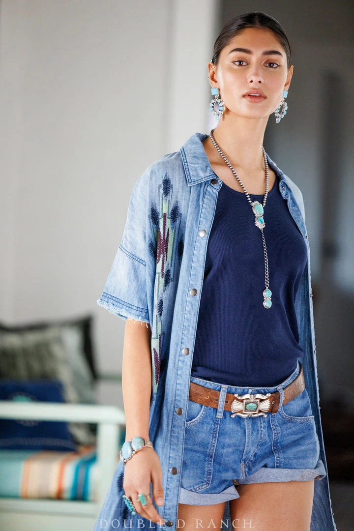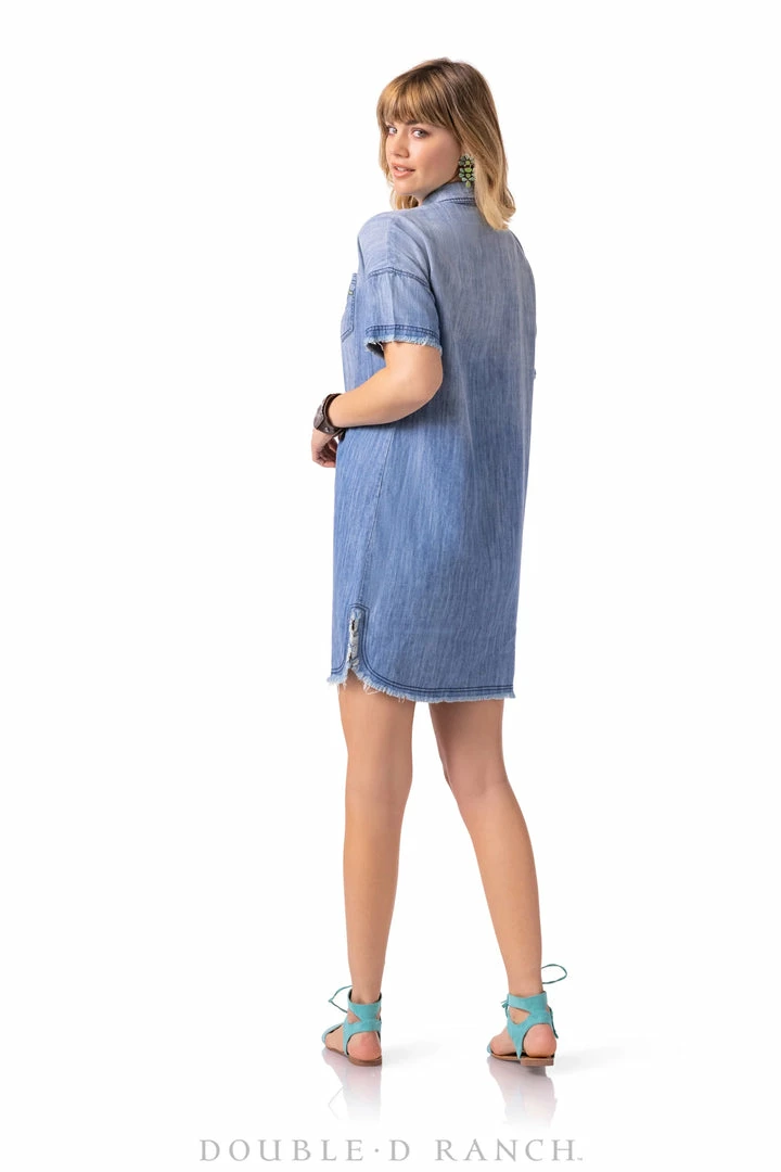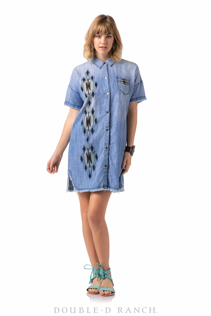 Β Denim Tencel is an absolute summer staple β itβs lightweight and endlessly versatile. This chic short-sleeve sundress features a classic collar, a full-length front placket, and one patch pocket balanced with a vertical display of southwestern design embellished with embroidery. Button it up as a dress or rock it open like a duster, you canβt go wrong!
