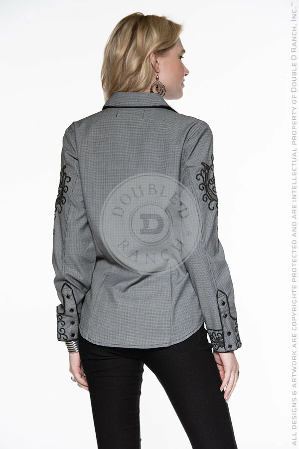 Double D Chalk Mountain Top with snap closure and detailed black embroidery stitching.