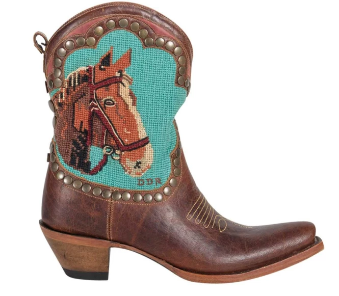 These boots feature an intricate embroidery on the shaft. Tiny brass studs and hearty pull tabs at the collar sit atop a riding heel.