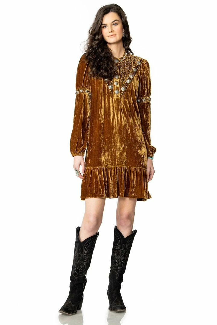 We are in love with this look. The long-sleeve silhouette has subtle gathers and pleats that give it vibes of both vintage and romantic, and we loaded it with southwestern style adding substantial studding and concho accents. Heck, we loved it so much, we made it like half a dozen colors! Throw it on with your favorite boots and you’ve got a head-turning look you can rock all year long.
