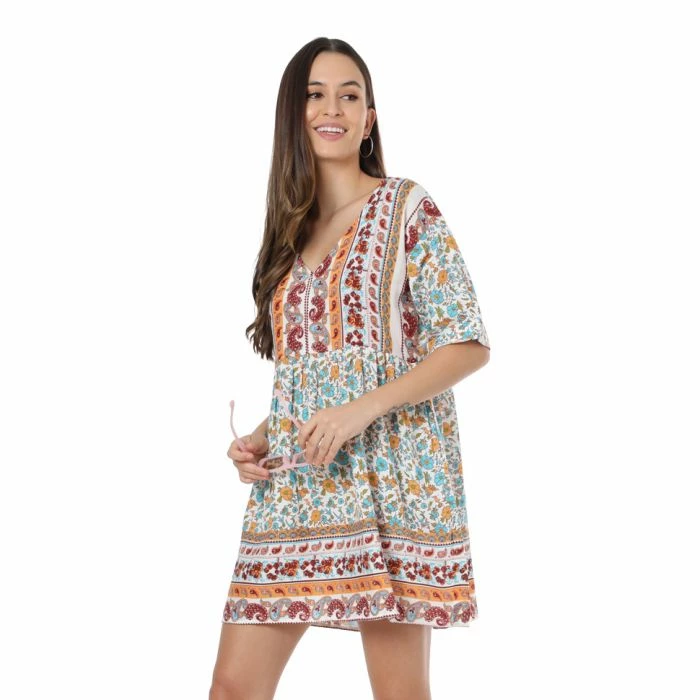 This beautiful printed white dress looks like midsummer woven into a fabric. Celebrate your free spirit with this beautiful printed short dress.