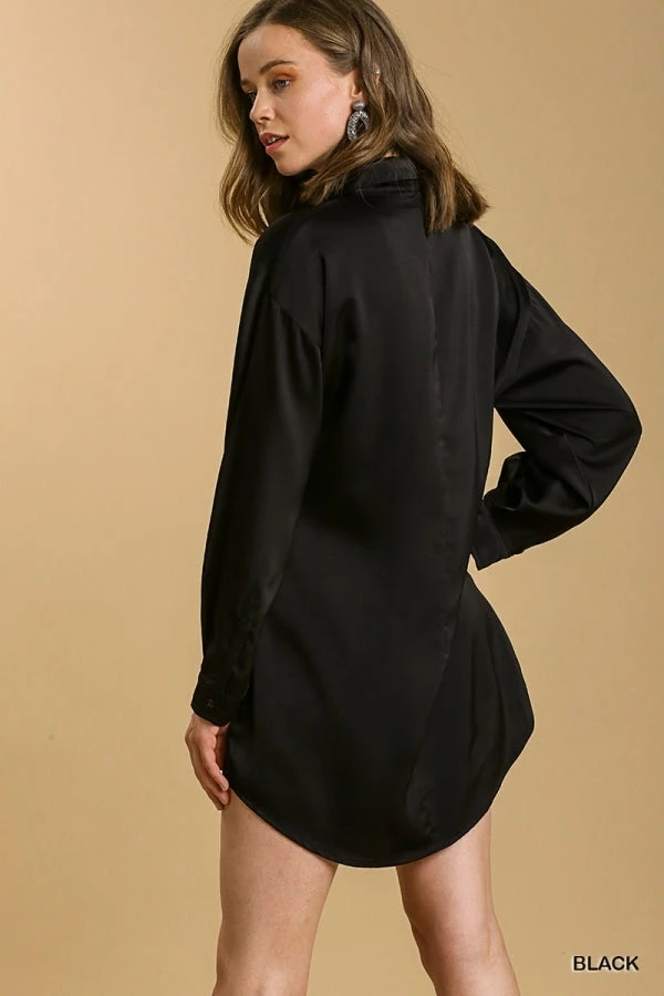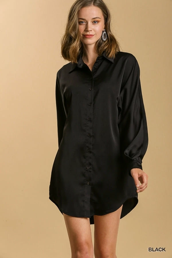 Satin Collar Button Down Long Sleeve Tunic Dress