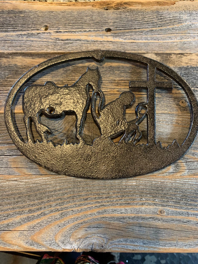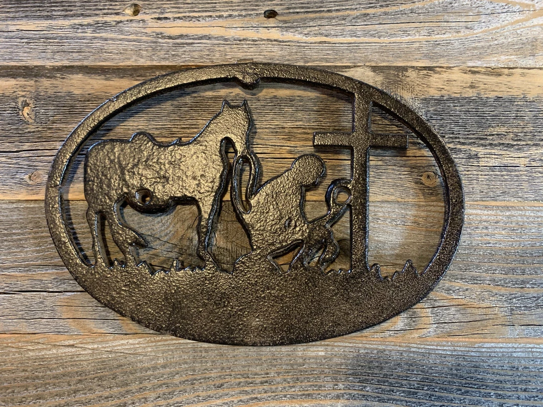 Praying Cowboy Metal Plaque made of cast Metal and has hanger on back to hang inside or outside. Β Brown finishΒ