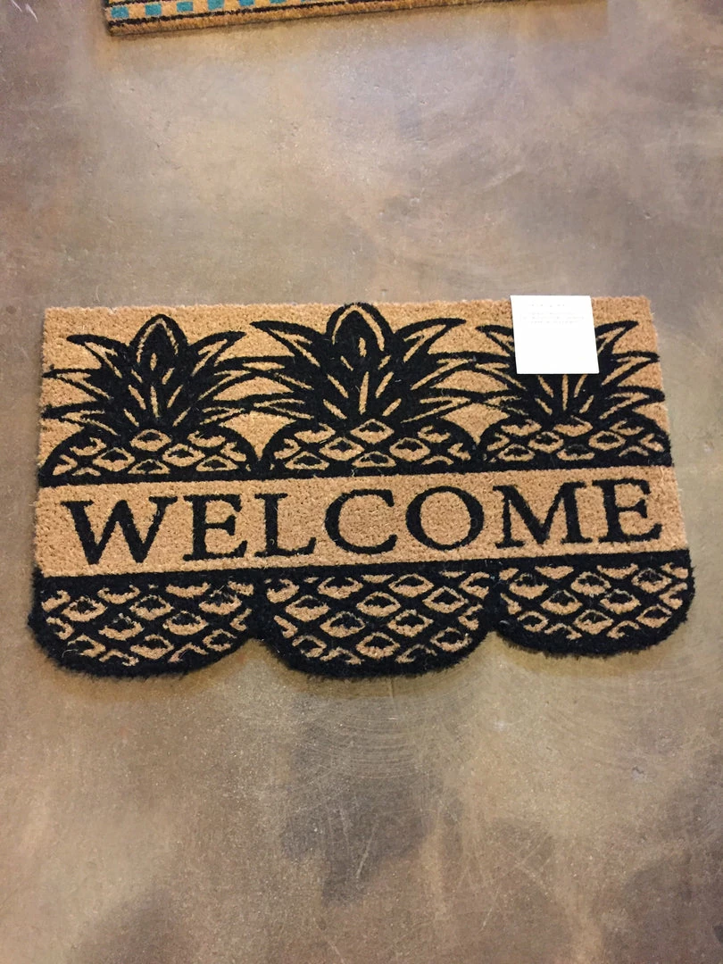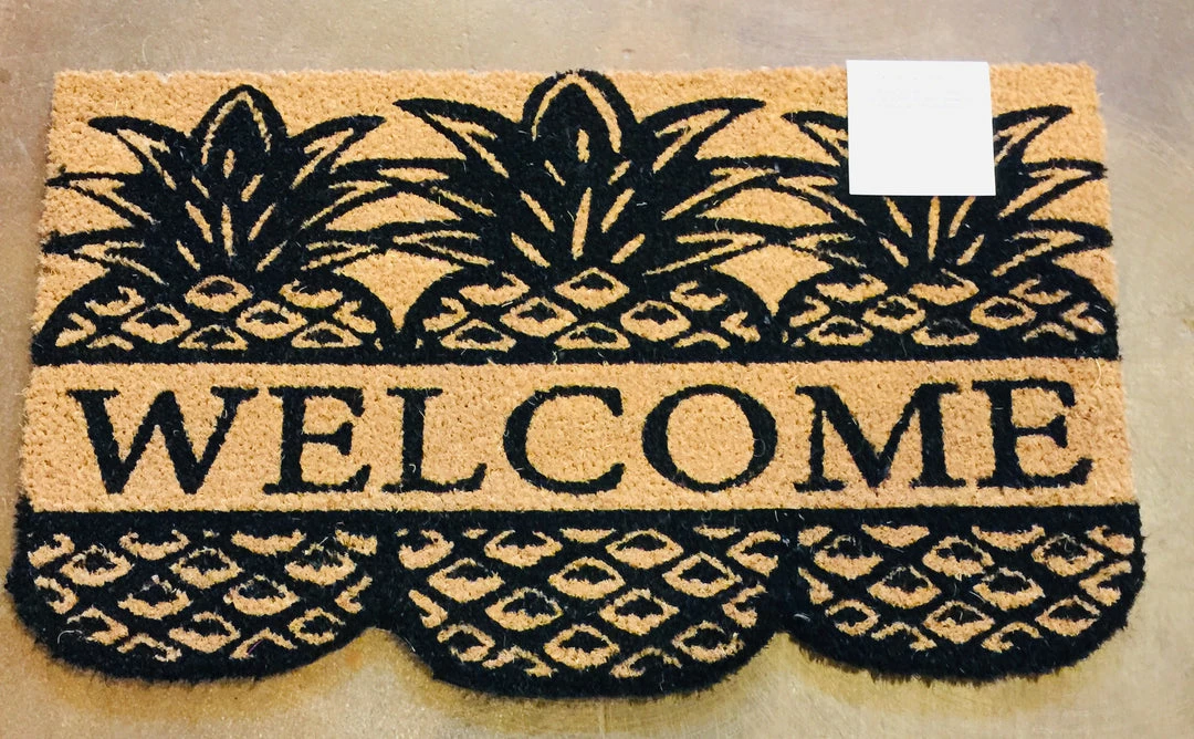 This is an awesome jute outdoor mat with Welcome written thru the 3 pineapples in black print.Β !00% natural coir with vinyl back.Β Β Use mat in sheltered area.Β Shake mat to remove dirt build up.Β By Evergreen