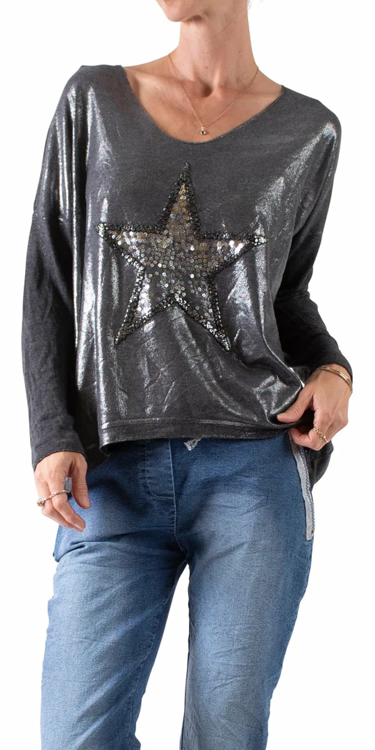 This knit sweater features a comfy batwing sleeve and a sequin star design.