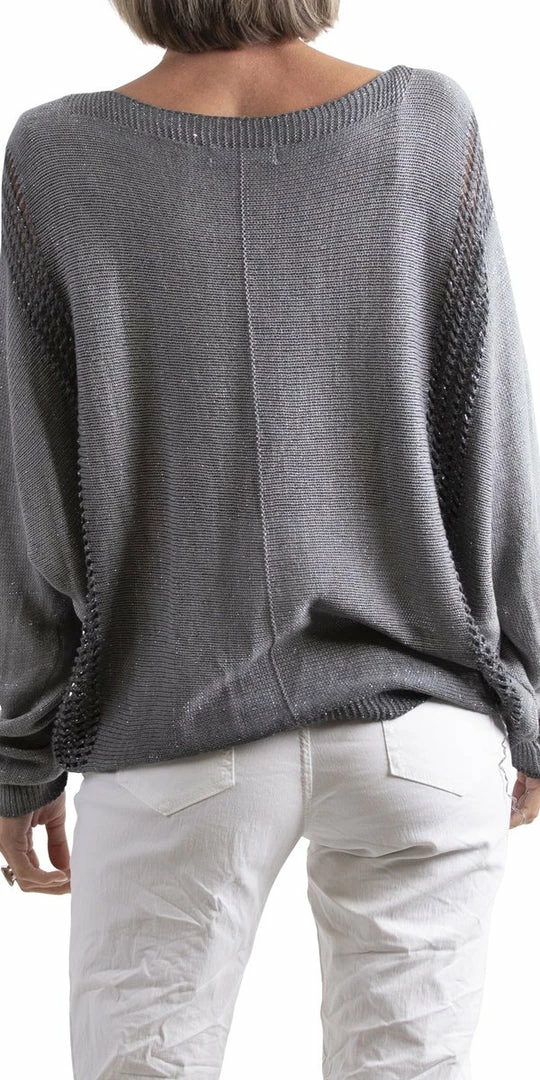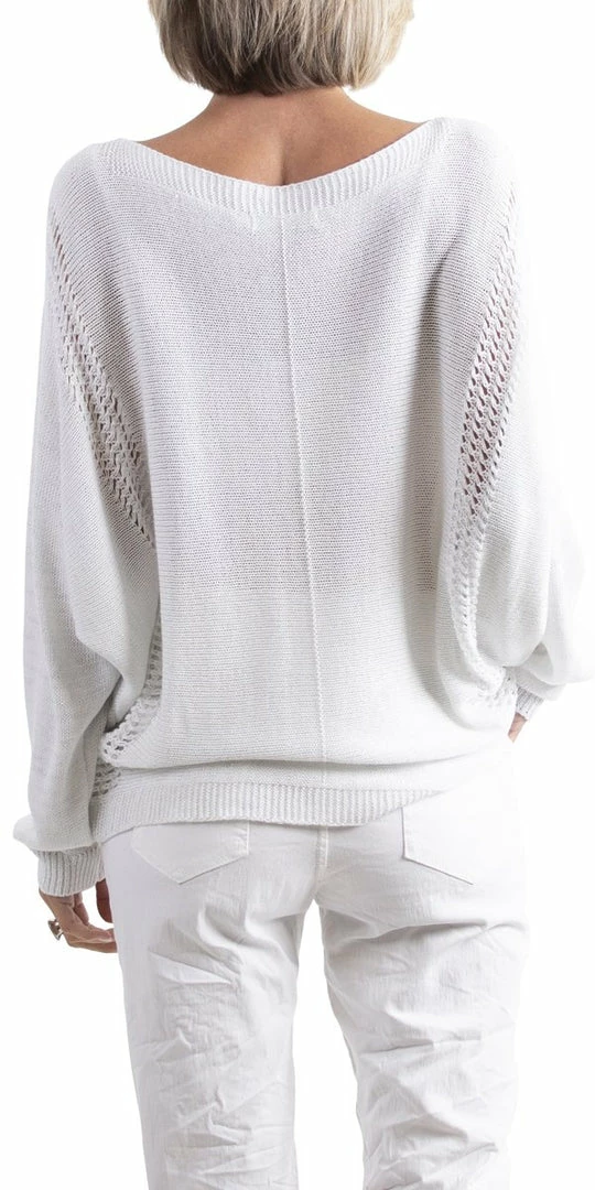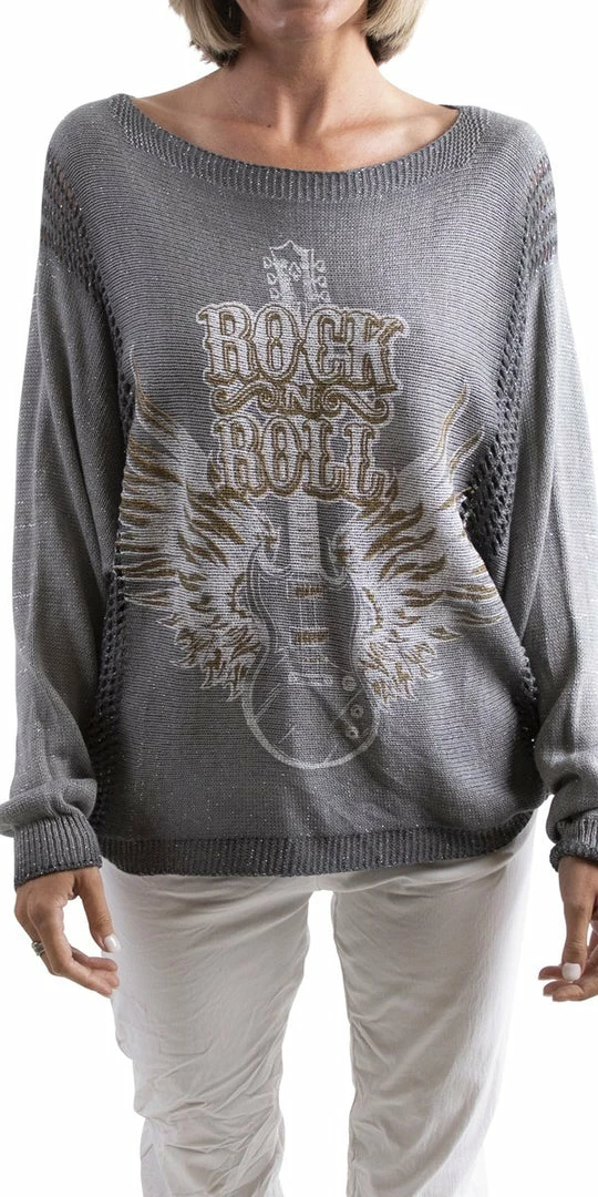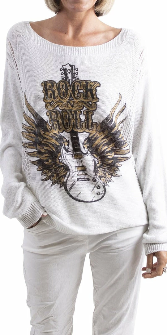 Scoop Neck Batwing Sweater With Virtical Crochet Detail Rock N Roll Print.