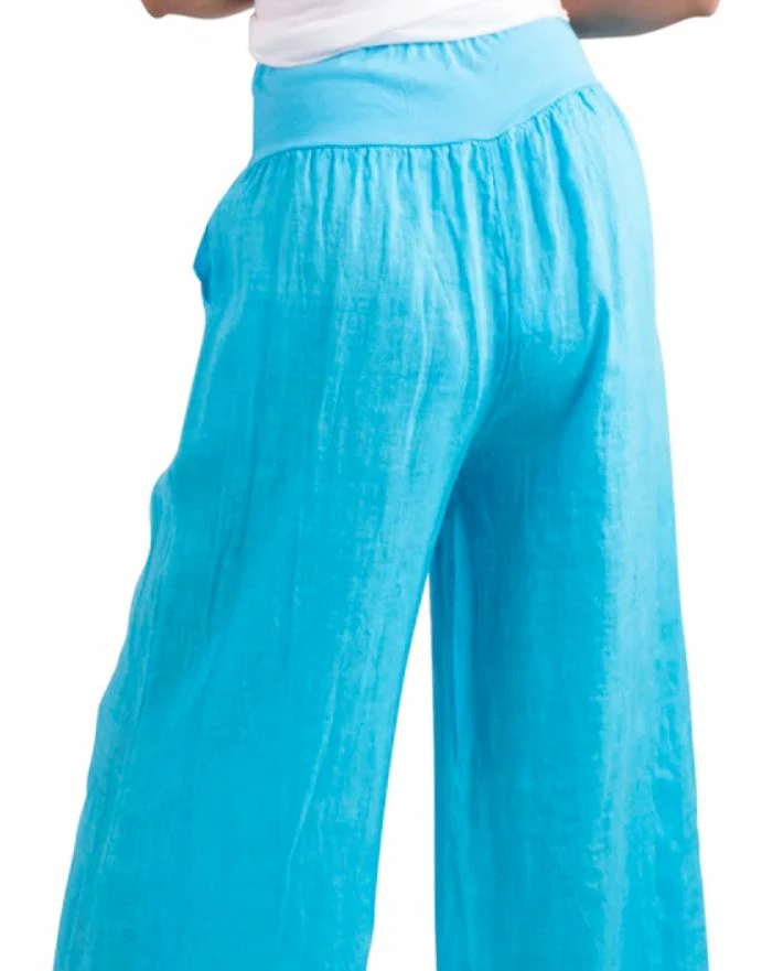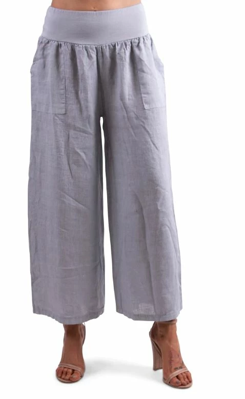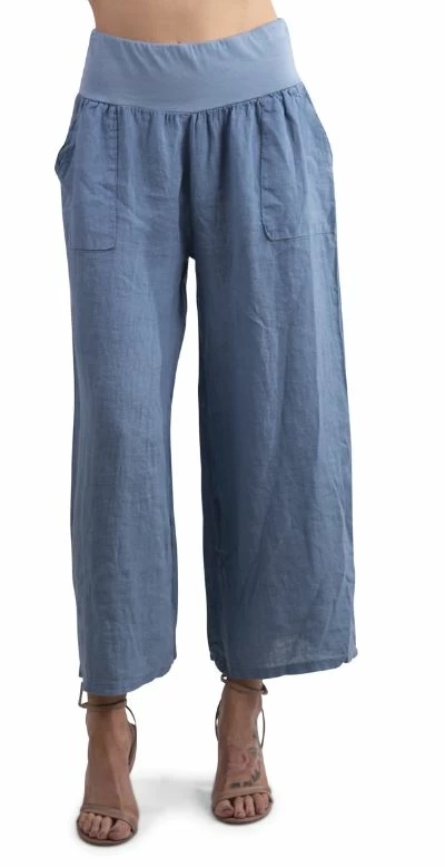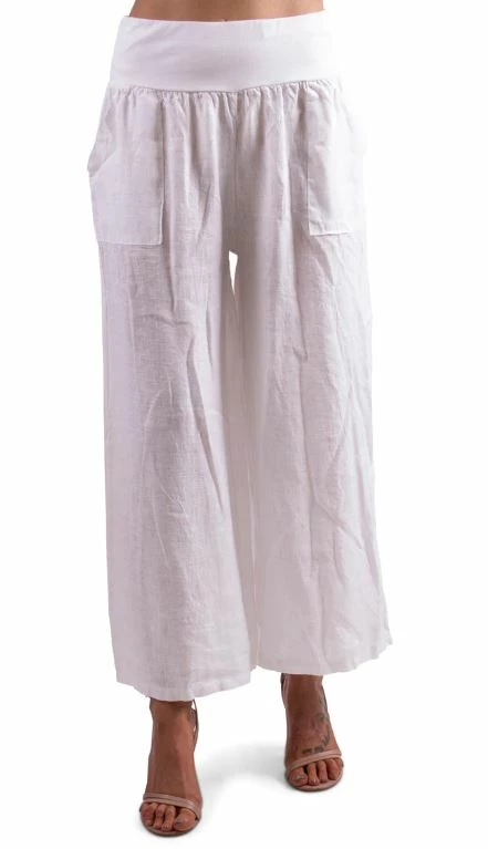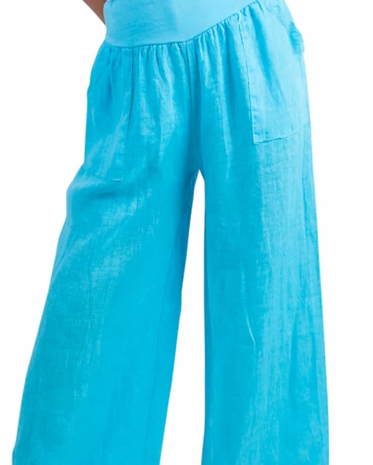 This comfy wide-leg linen pant comes with a stretch waistband for custom fit and beautiful front pocket details to add style.