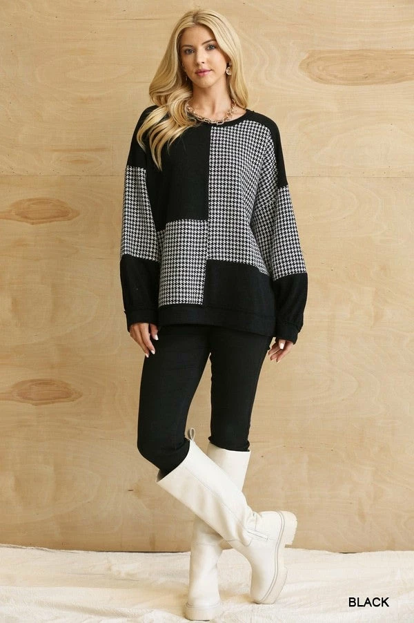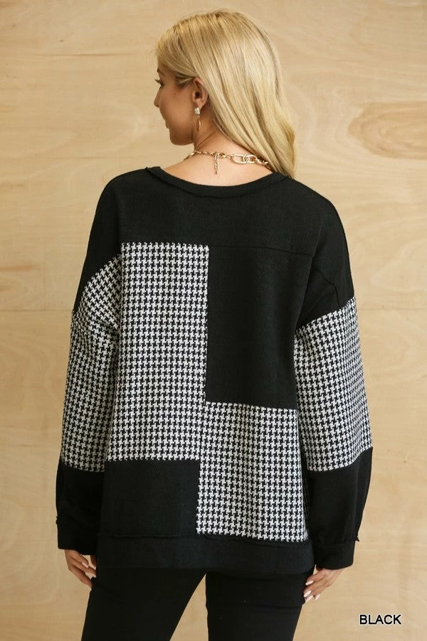 Textured Houndstooth and Color Block Knit Loose Fit Top