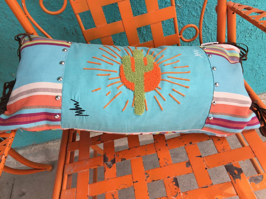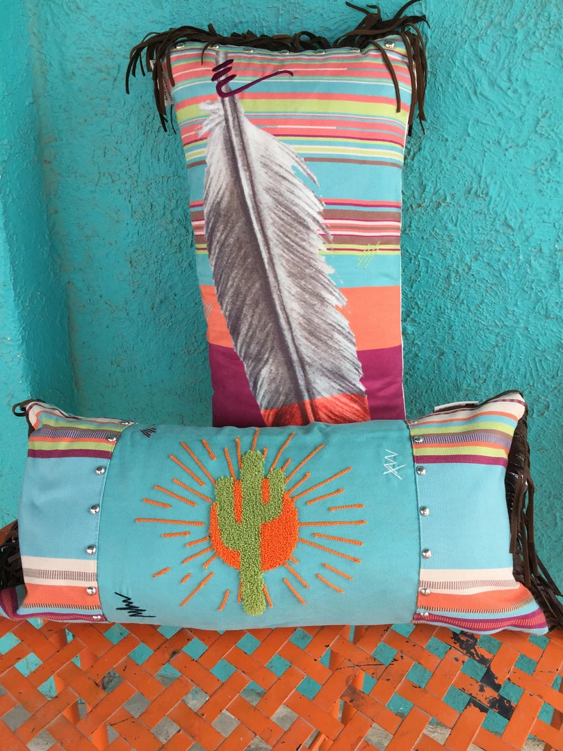 This colorful oblong pillow is bursting with design details. Featuring a textured loop embroidered yellow cactus and red sunburst on a turquoise faux suede background, this decorative pillow compliments the Serape collection. Finished with chocolate faux leather fringe, rounded silver studs complete the look. Measures 24″ X 12″. Hidden zipper closure. Studs are embedded into the fabric for durability, not glued. Imported.