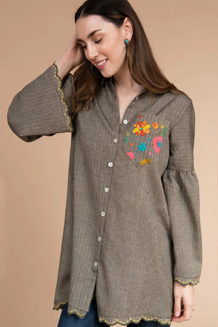 Long sleeveΒ tunic with pocket embroidery in a brown tweedΒ