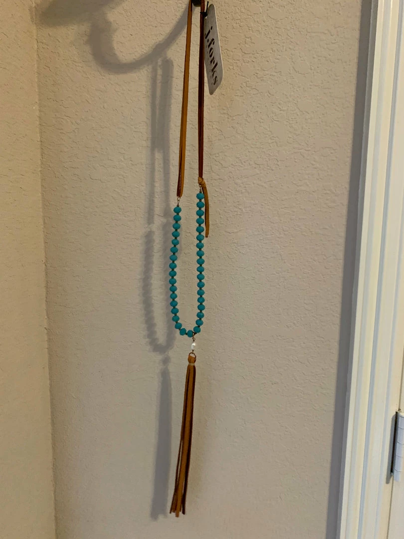 2- Turquoise Chrystal with Fresh Water Prarl and deerskin tasselsย