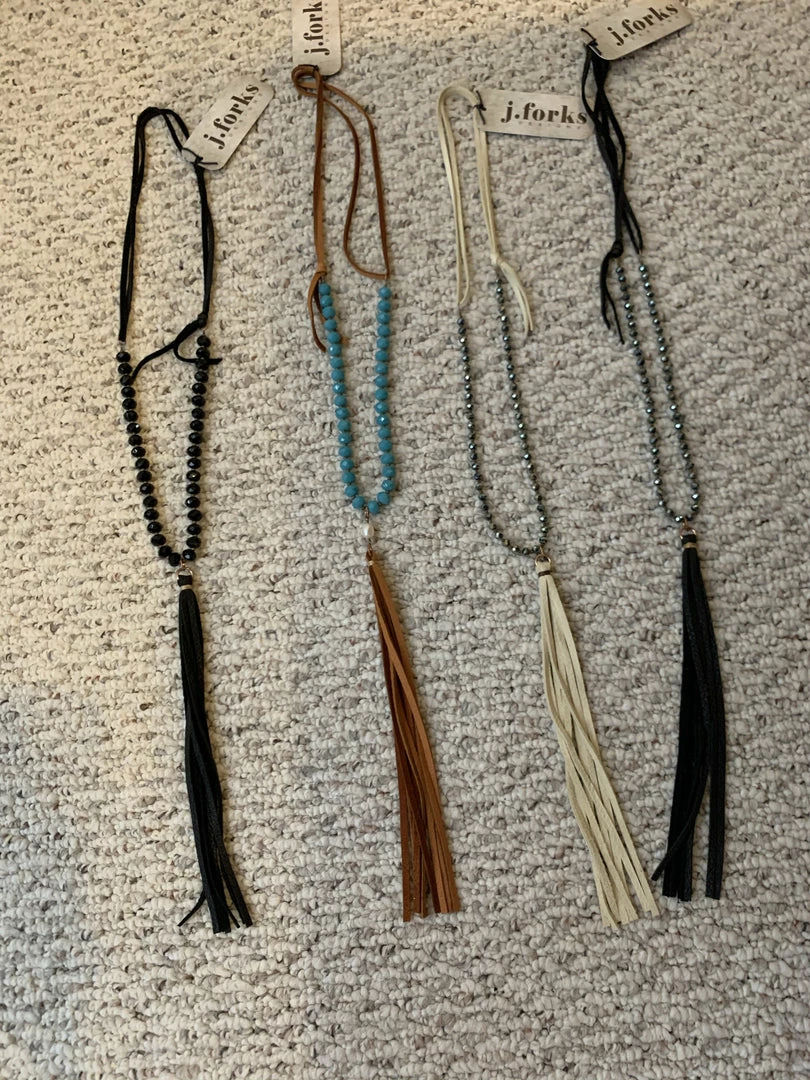 Assorted beaded necklaces with deer skin fringe by J Forks Designs .