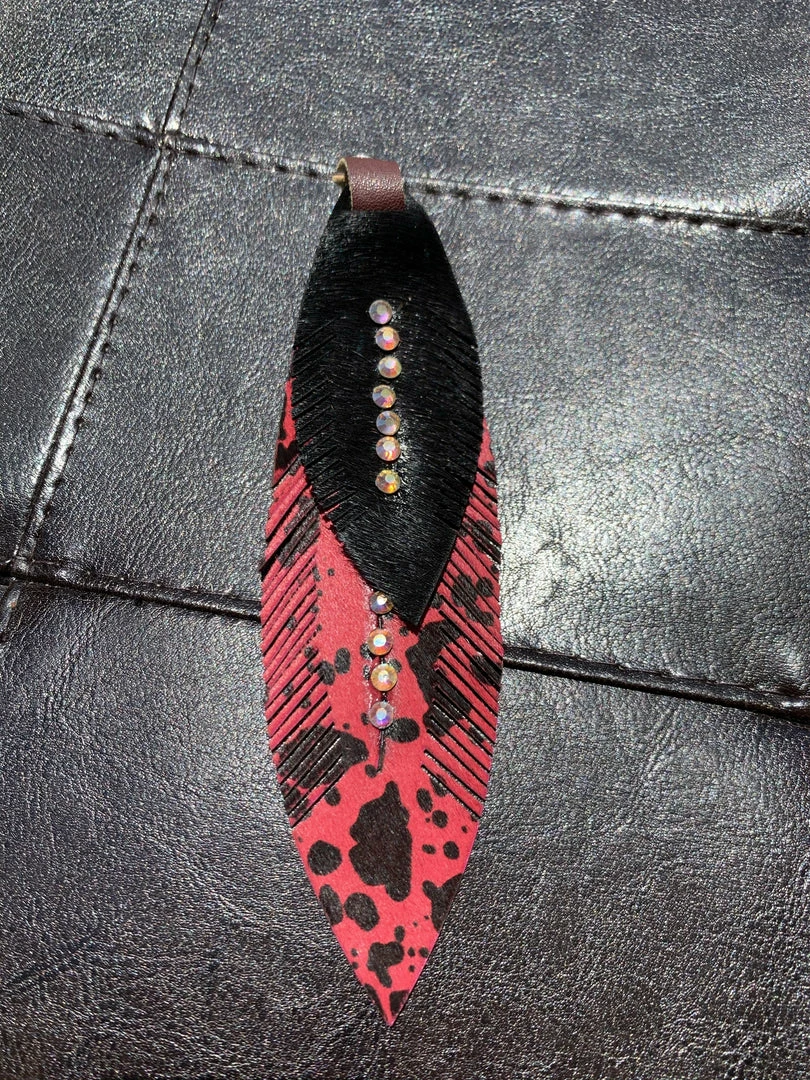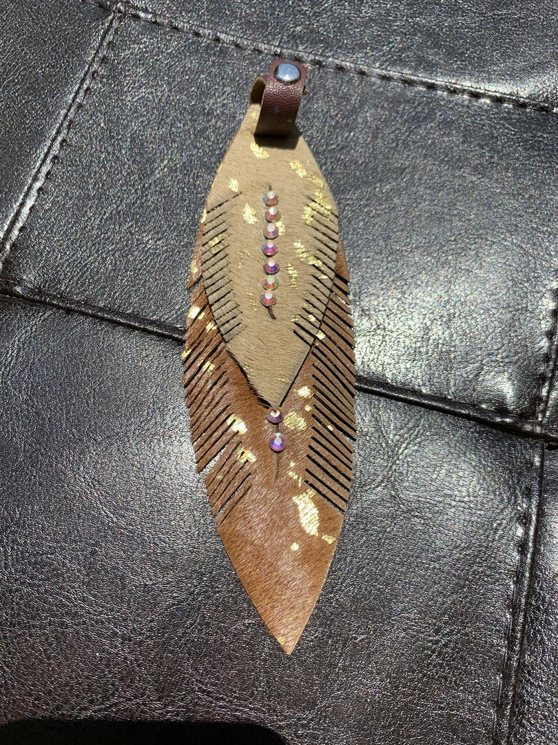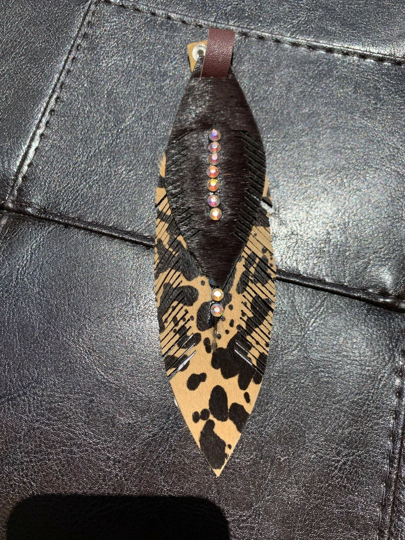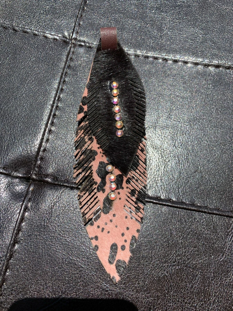 Hair on Hide leather Feathers with leather snap attachment on top to add to necklace, purse or hang in car. Appx 6” long 1.75” width