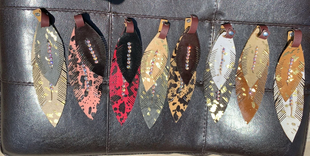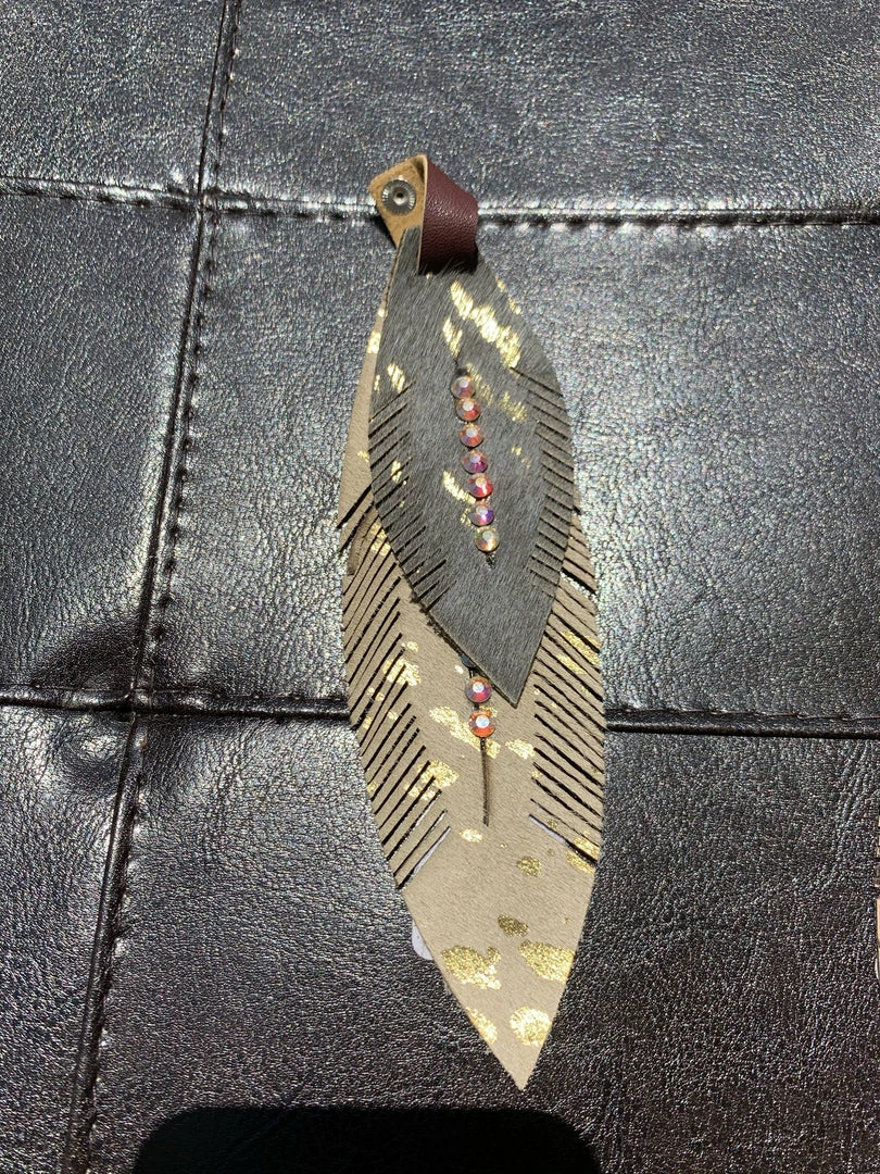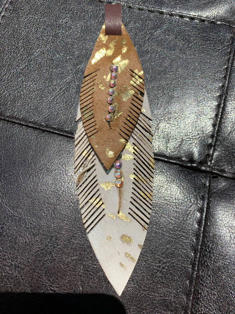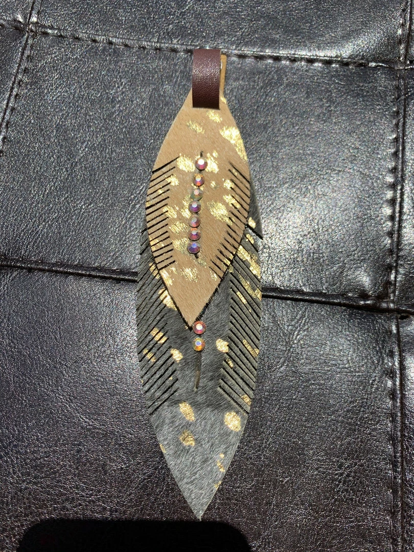 Hair on Hide leather Feathers with leather snap attachment on top to add to necklace, purse or hang in car. Appx 6” long 1.75” width