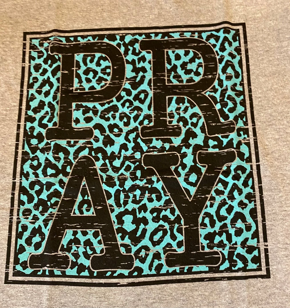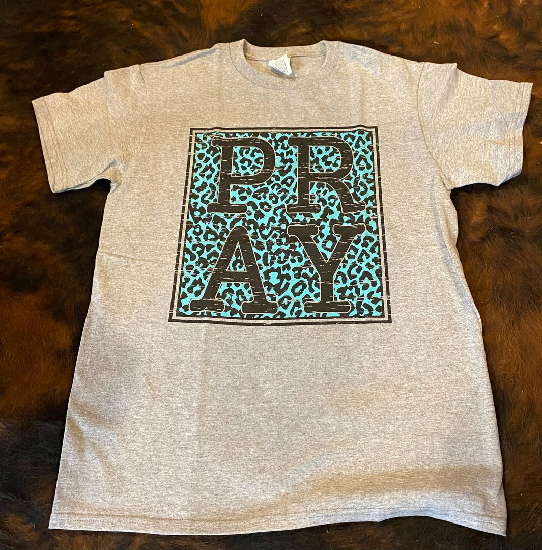 PRAY with Turquoise Animal Print on Grey T-shirt