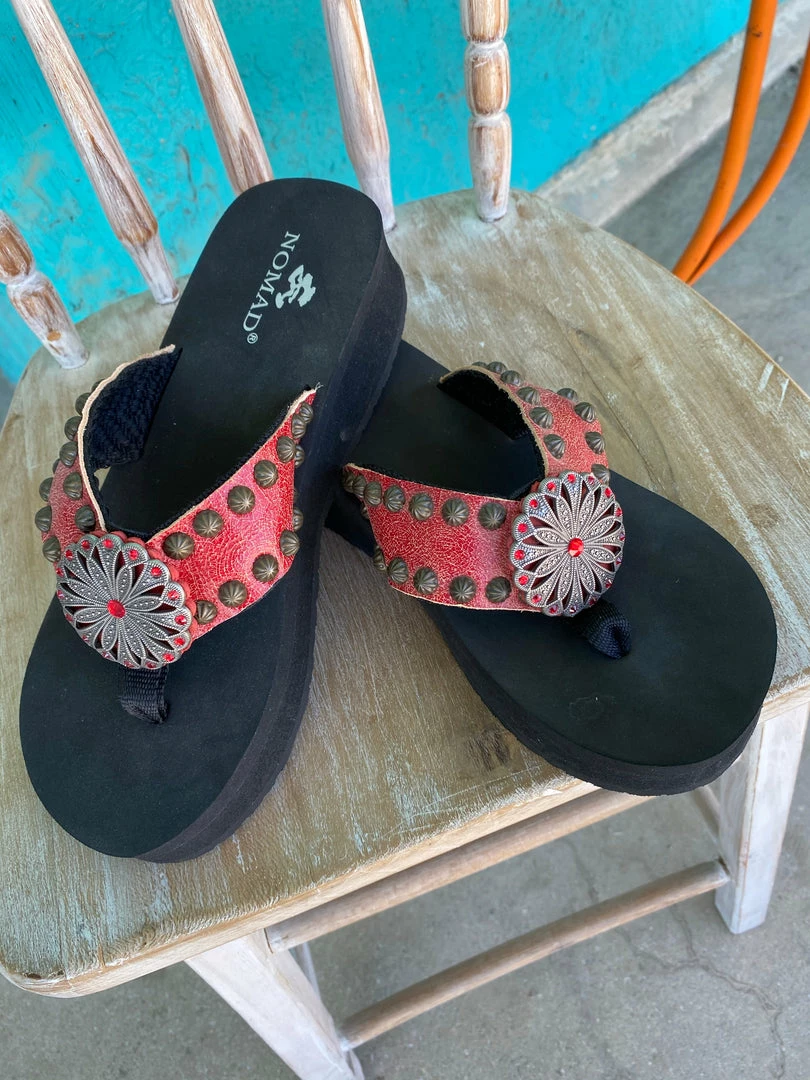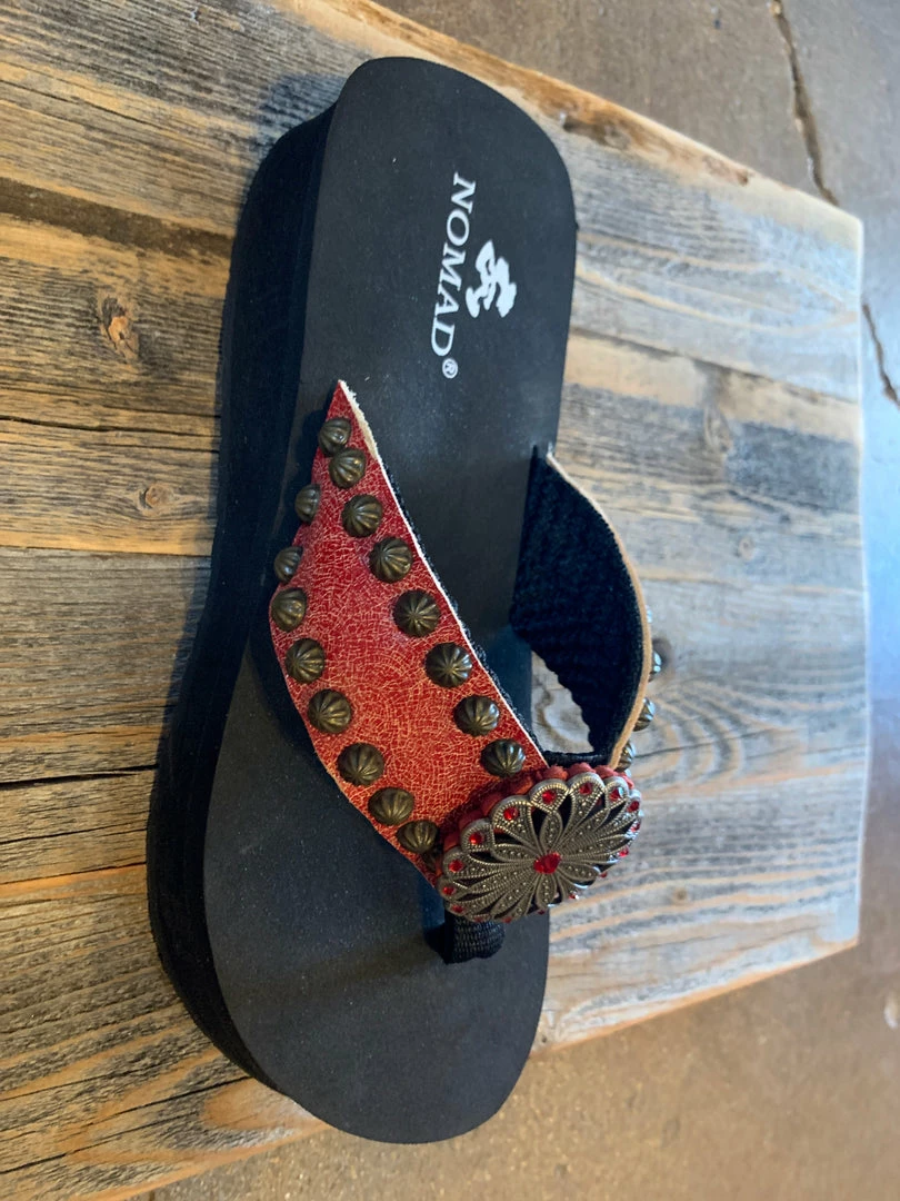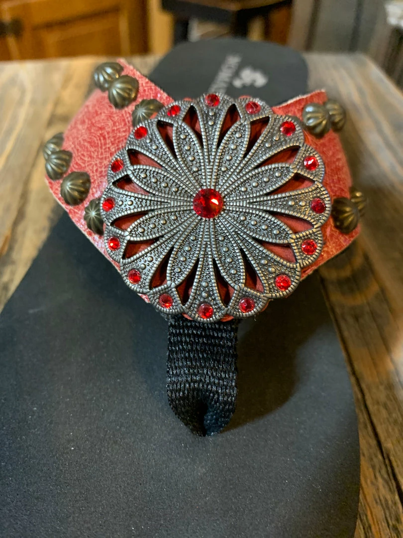 Red Distressed Leather Flip Flops with silver studs and Floral Concho with Red Swarovski Crystals.