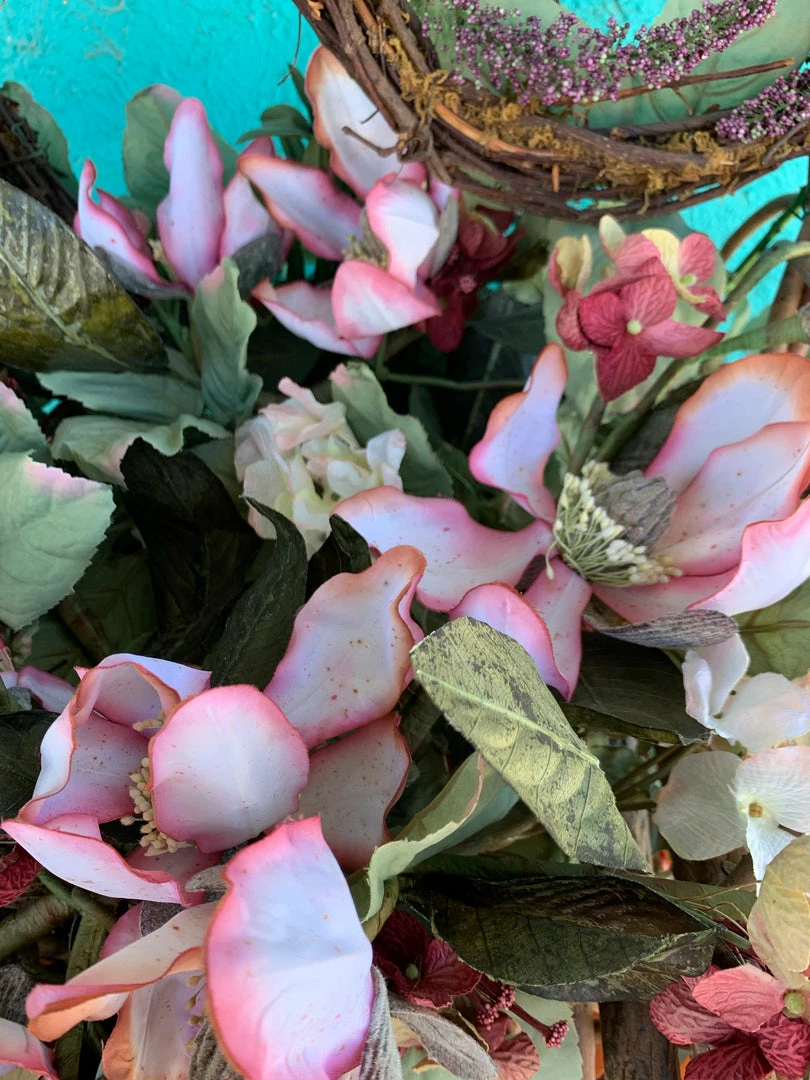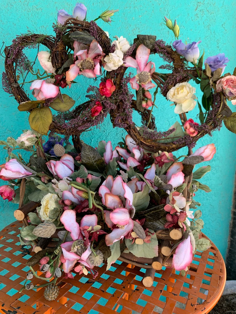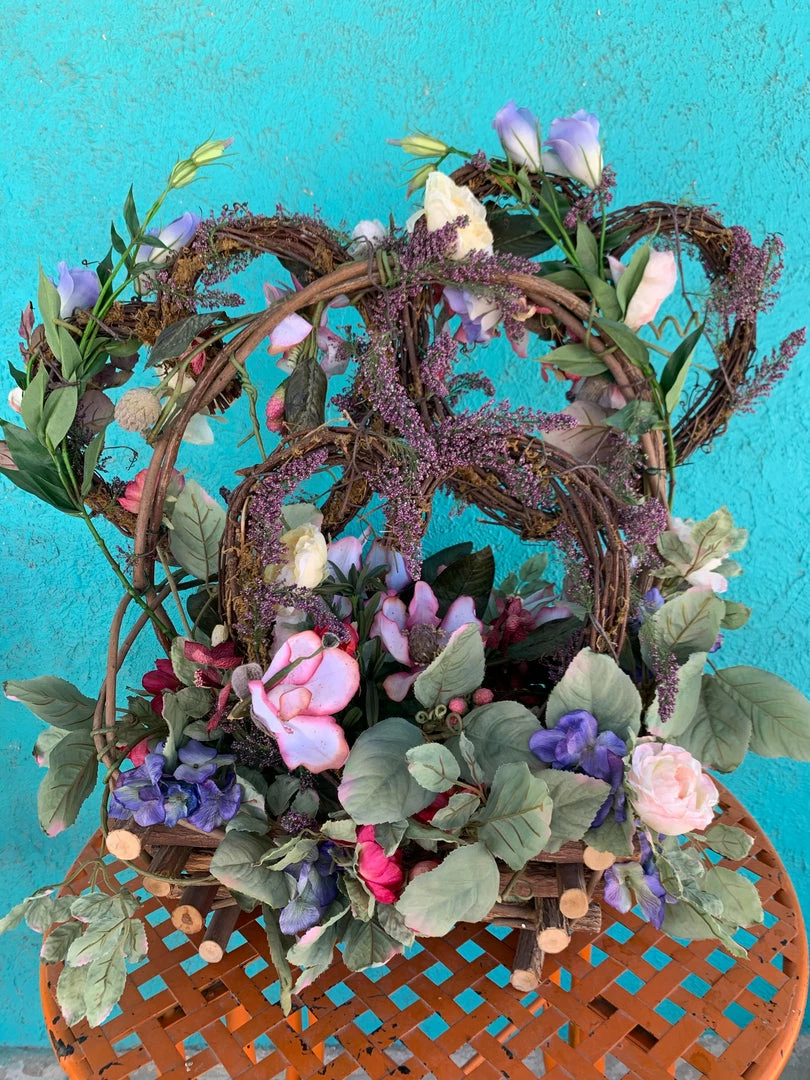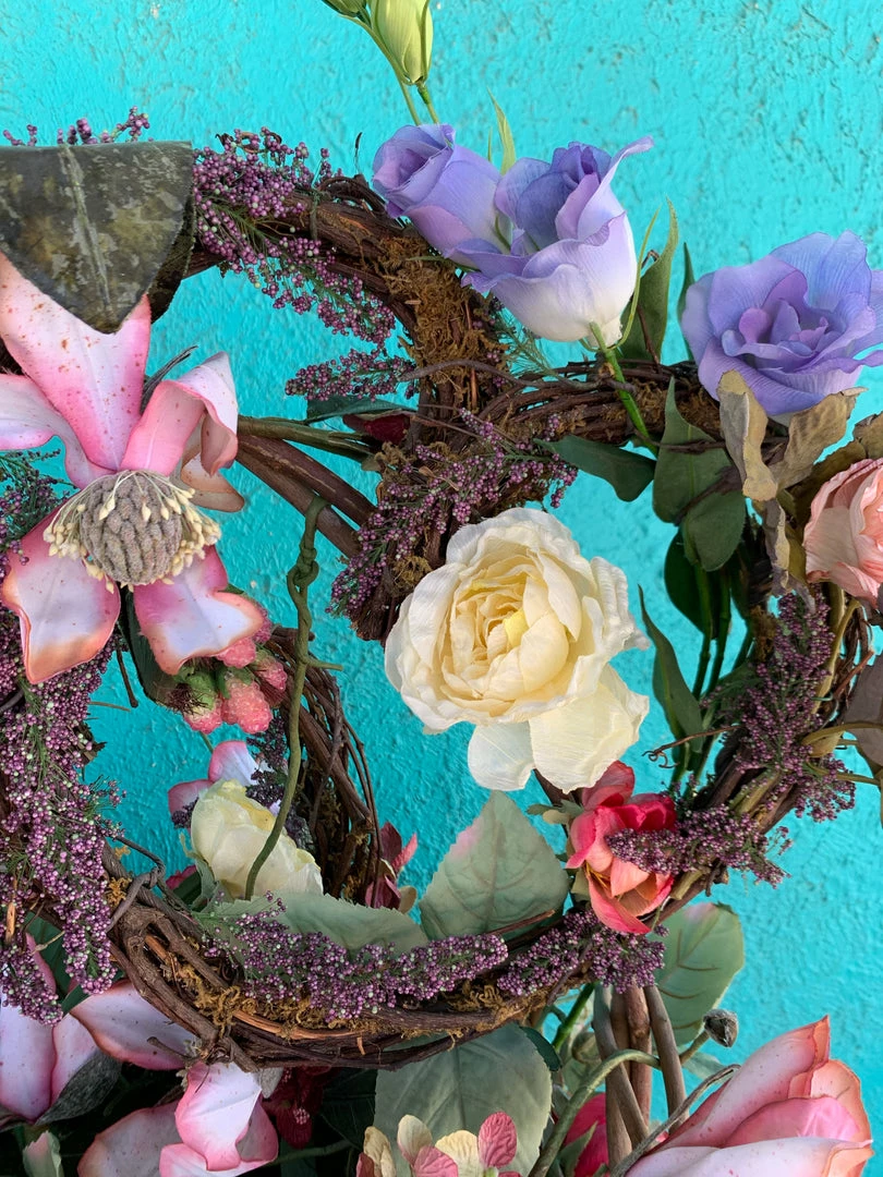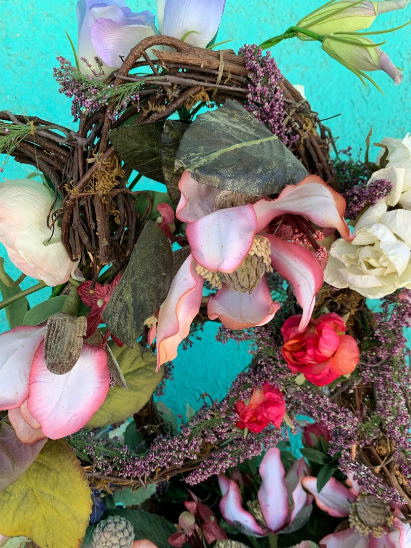 Spring Floral Basket with various flowers in multi colors to blend a unique one of a kind piece for any area in your home or outside. Β Sits in a willow handled basket. Β Stands 30β and width 30βΒ