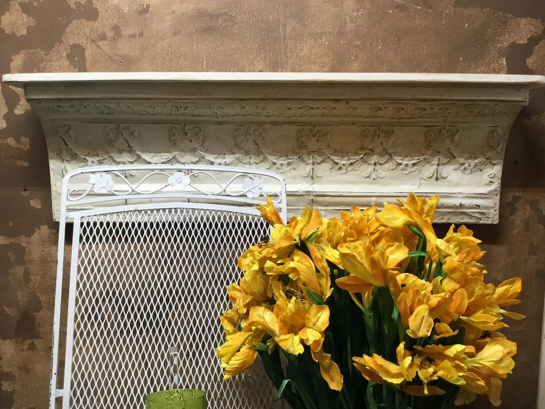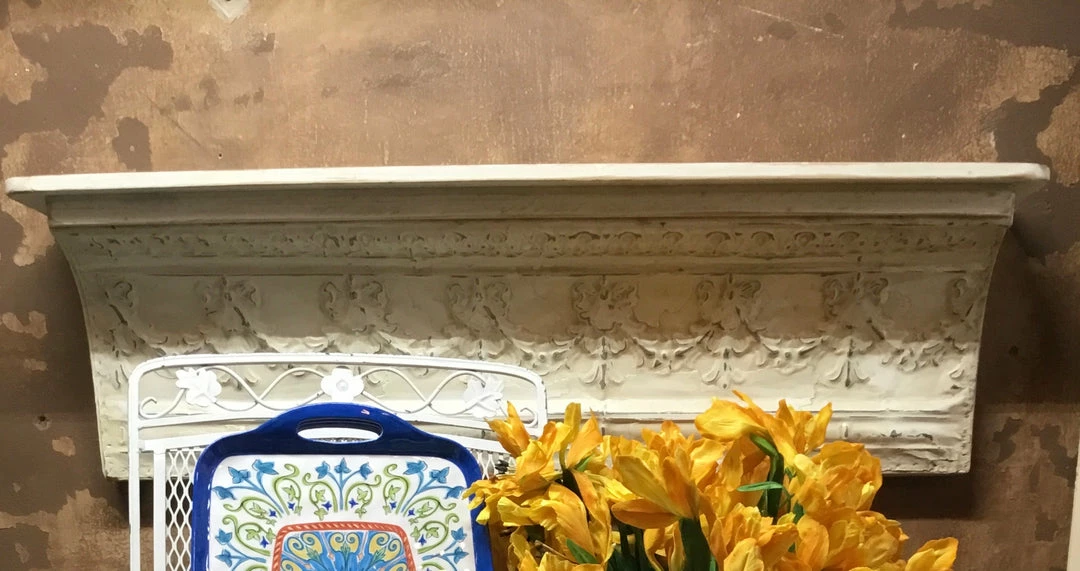 Vintage tin repurposed into a shelf Nd distressed shabby chic. Β Wood on top for shelf and tin on bottom. Β Measures 46 β by 13.5β